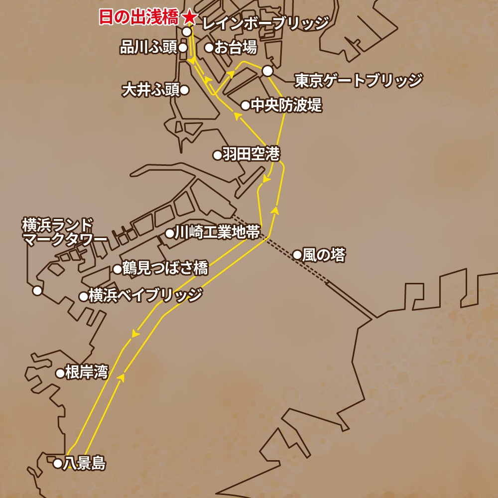 日の出桟橋を出航後、レインボーブリッジ、大井ふ頭のガントリークレーン、東京ゲートブリッジを通過した後、通常のクルーズでは巡ることのできない羽田空港沖、川崎工業地帯、鶴見つばさ橋、根岸湾を航行し八景島手前で折り返す特別航路となっております。