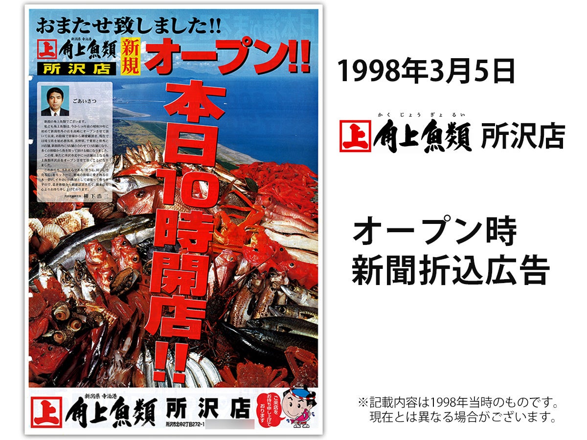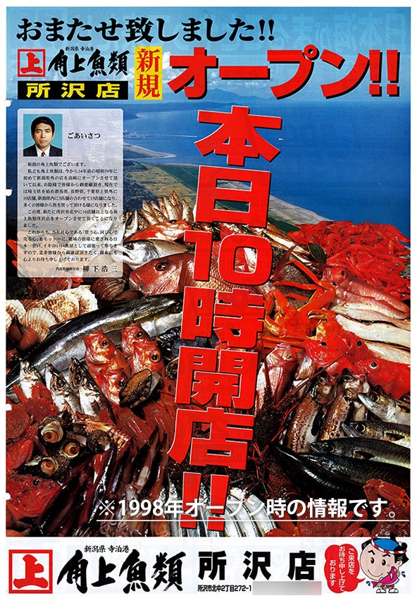 今回リニューアルオープンする「角上魚類 所沢店」は1998年3月 所沢市北中2丁目272-1 に開業、同地にて26年の長きにわたってご愛顧賜ってまいりました。