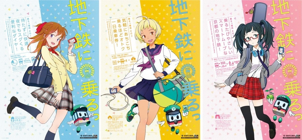「地下鉄に乗るっ」は、京都市営地下鉄・市バスの利用促進を目的とした、地下鉄・市バス応援キャラクター「太秦萌」、「松賀咲」、「小野ミサ」、「太秦麗」、「小野陵」、「十条タケル」らによるPRコンテンツ。平成25年に地下鉄利用促進ポスターに採用されて以来、京都市交通局の関連広報のみに留まらず、様々な広報媒体に展開しています。