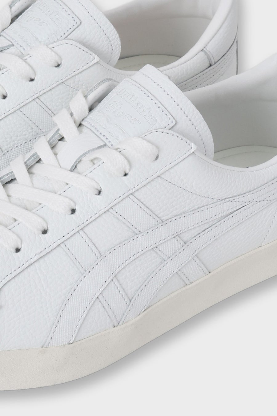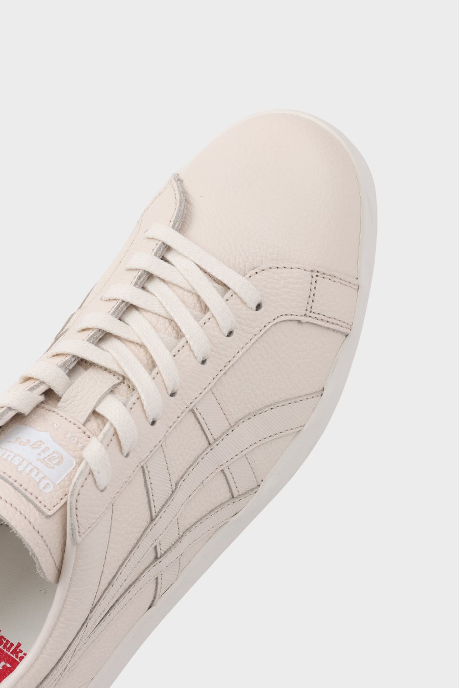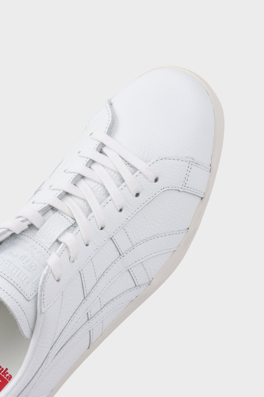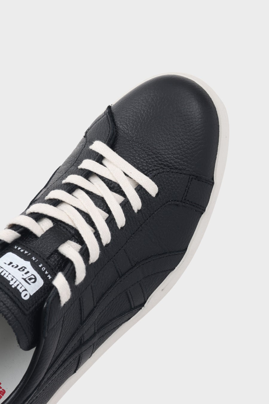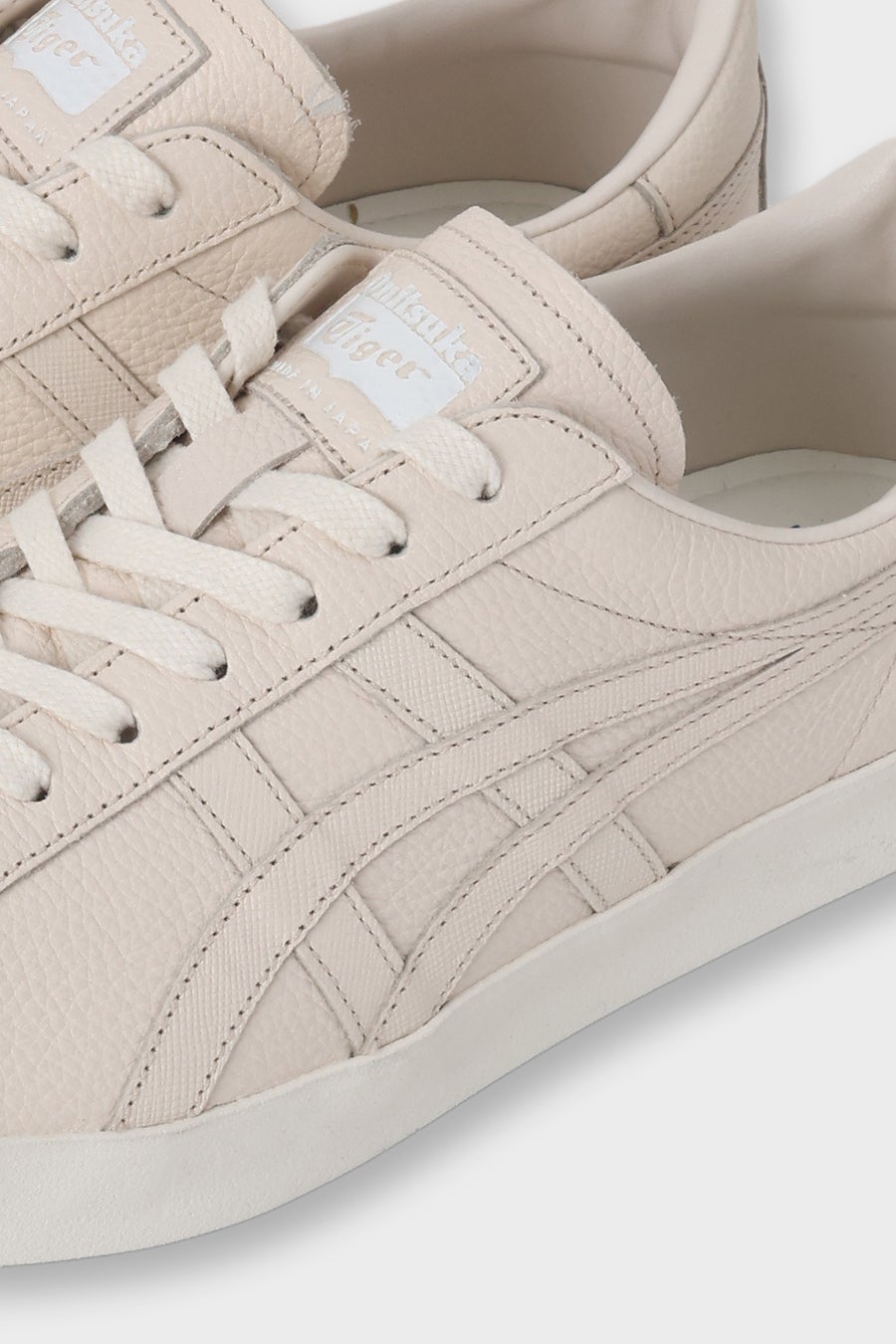 Onitsuka Tigerのシグネチャーマーク「オニツカタイガーストライプ」のパーツには、 アッパーと同色のサフィアーノ型押しレザーを使用。サフィアーノ型押しレザーはシャープな光沢感を持ち、角度によって上品に艶めきます。 アッパーのシュリンク加工シボレザーとの対比が、洗練されたアクセントを与えています。