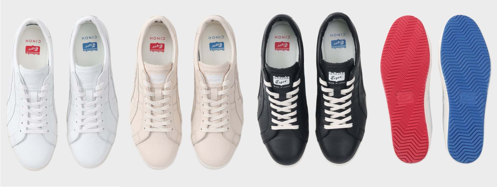 全てのカラーで中敷ロゴとアウターソールにOnitsuka Tigerの定番配色であるレッドとブルーを左右で配色。歩行や着脱などの動作を伴ってカラーが覗く、CINOHらしいさりげない遊び心を演出しています。