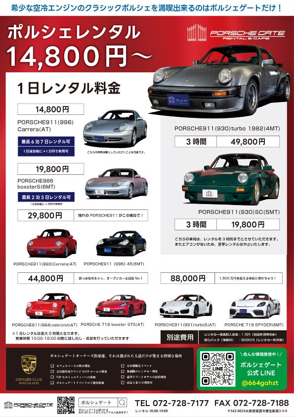 株式会社ドリームゲートは『空冷ポルシェを守れ!』というミッションの元、大阪箕面にてポルシェレンタル・カフェ ポルシェゲートを運営しております。