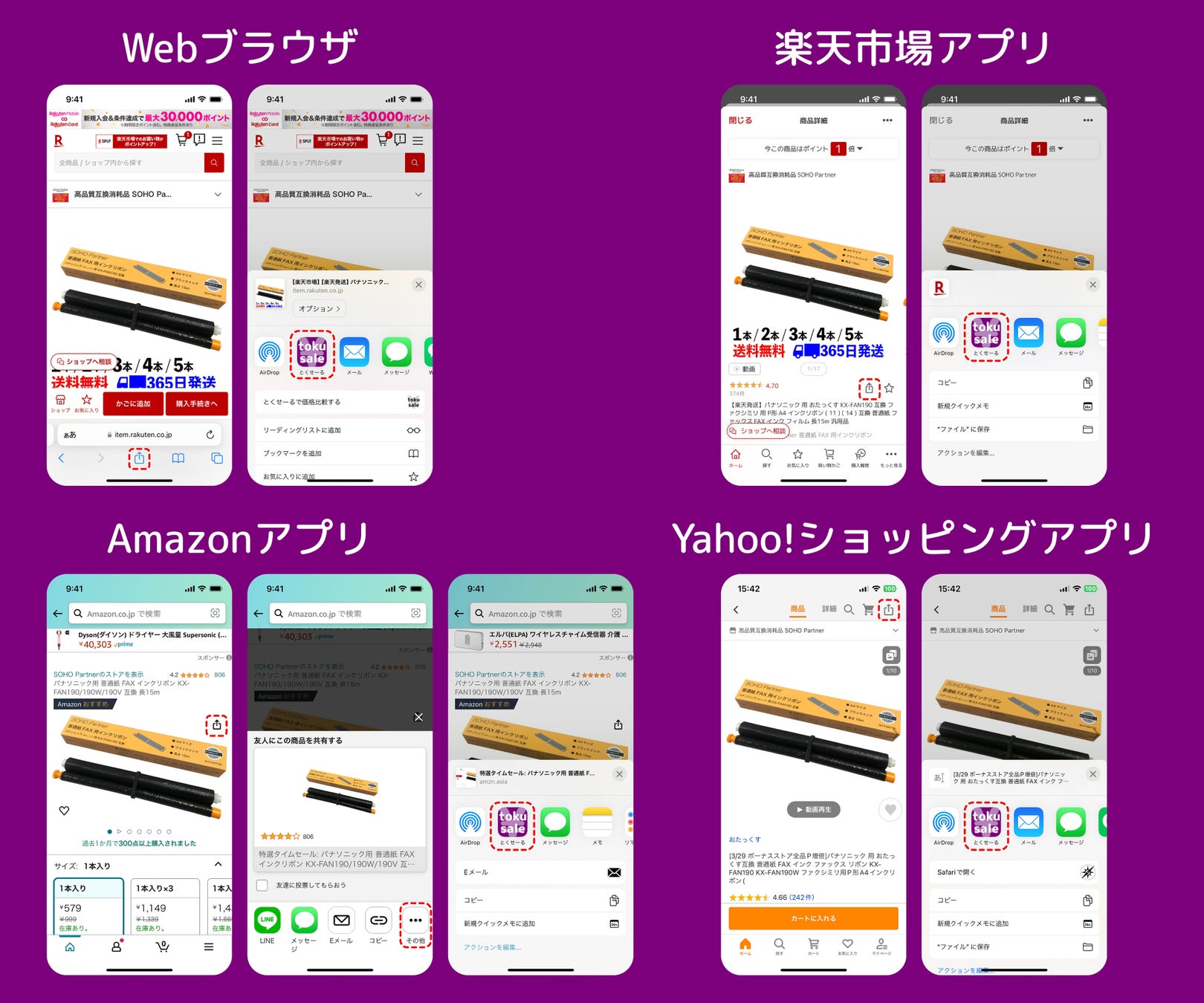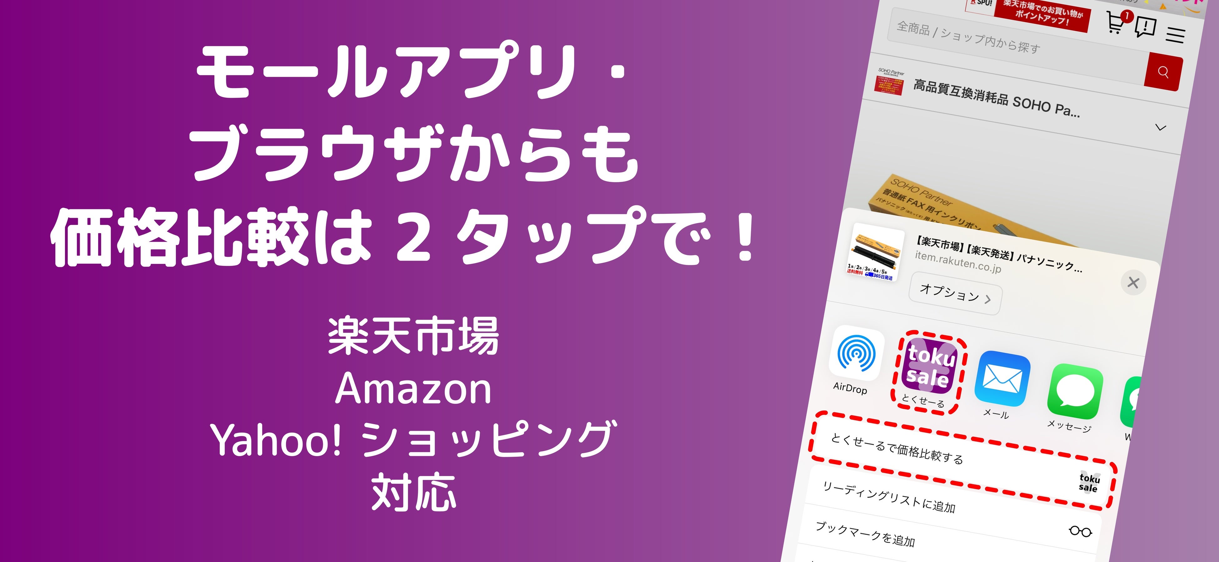 新機能では、ブラウザ・アプリの商品ページで共有ボタンをタップし、「とくせーる」アイコンを選択するだけで、「とくせーる」アプリ内で3つのモールを横断した商品検索が可能となります。これにより、利用者は簡単かつ迅速に商品の価格を比較し、最適な購入先を選択できるようになります。