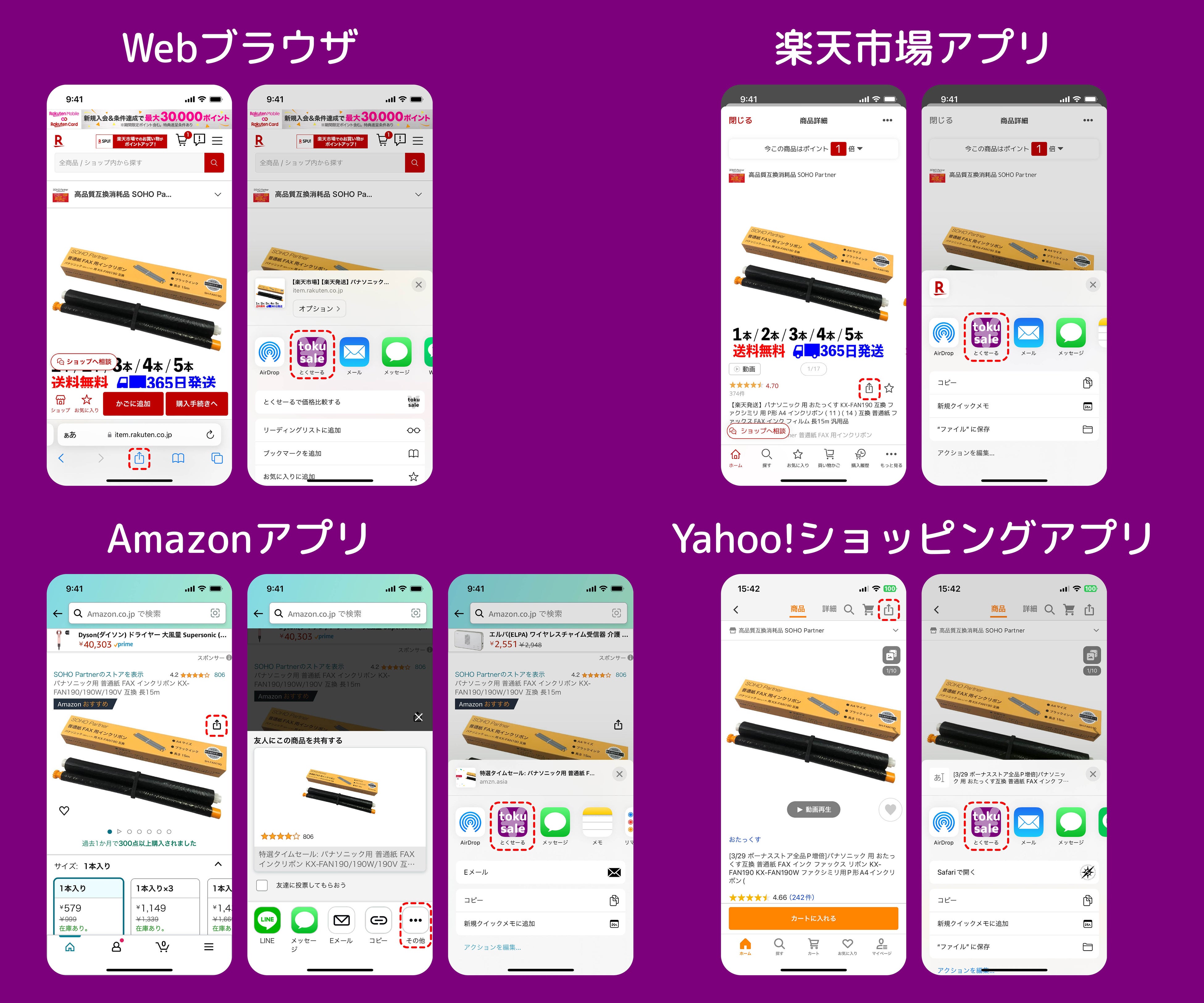 楽天市場、Amazon、Yahoo!ショッピングのアプリやSafariなどのブラウザからも、同じ商品の最安値を簡単に検索できるようになりました。