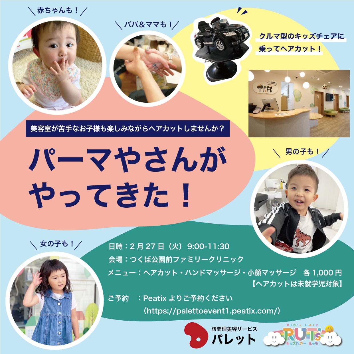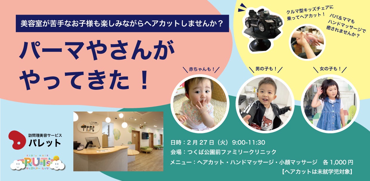 この度パレットは、キッズカット専門店KIDʼs HAIR RUTʼsの小寺裕隆さんと共催し、つくば市内の小児整形外科「つくば公園前ファミリークリニック」にて、初となる出張キッズカットイベントを開催いたします。お子さんの髪は、日差しを浴びたり、汗をかいたりする中で、その日のがんばった出来事や些細な変化を顕著に表します。身だしなみを整えるだけでなく、ヘアカットをコミュニケーションツールとして捉え、訪問美容を通じて普段忙しいパパやママ、美容室が苦手なお子さんにも楽しみながら、日々の成⻑を感じてもらえるイベントです。