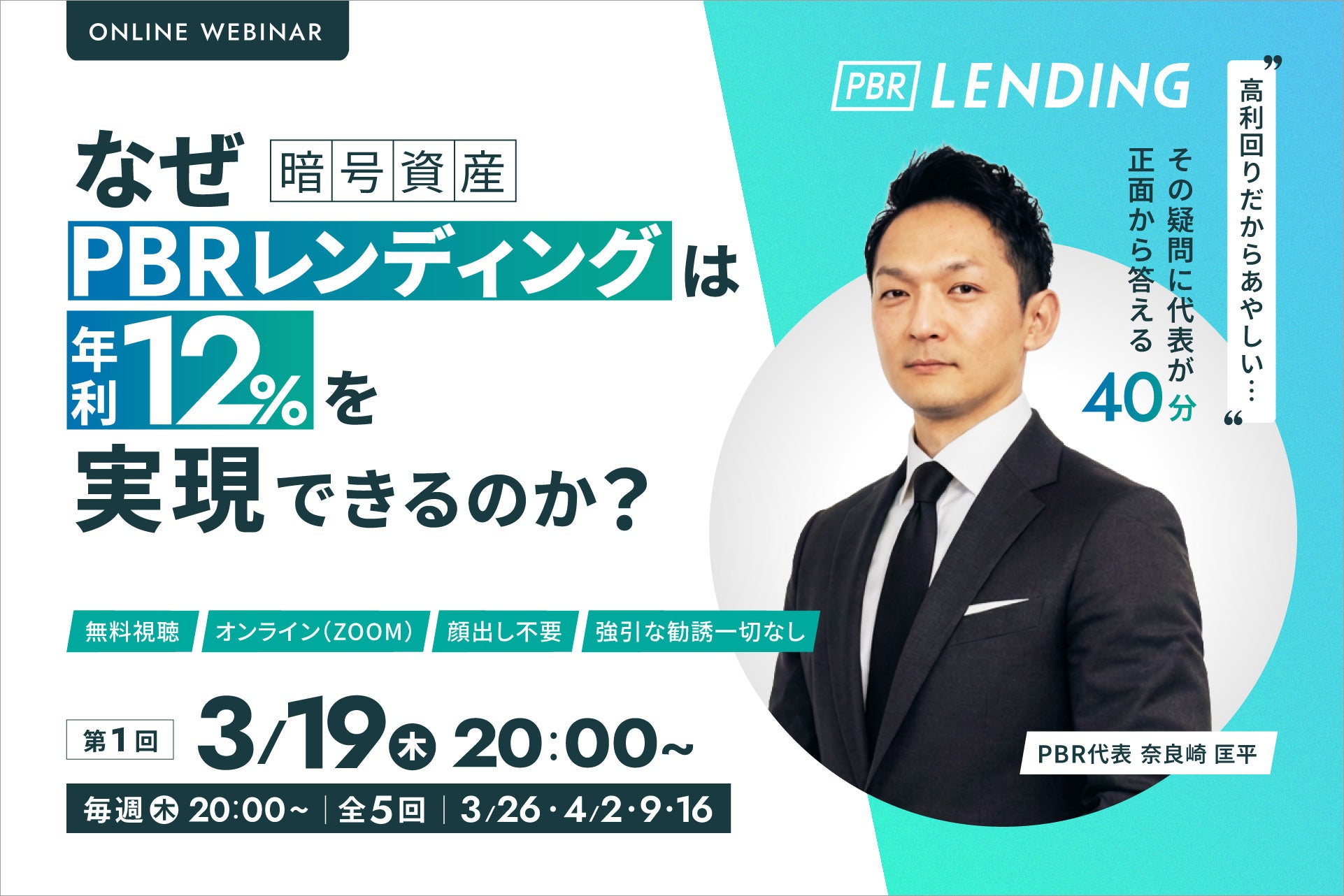5週連続無料ウェビナー開催「なぜPBRレンディングは年利12%を実現できるのか?」3/19(木)~4/16(木)毎週木曜開催