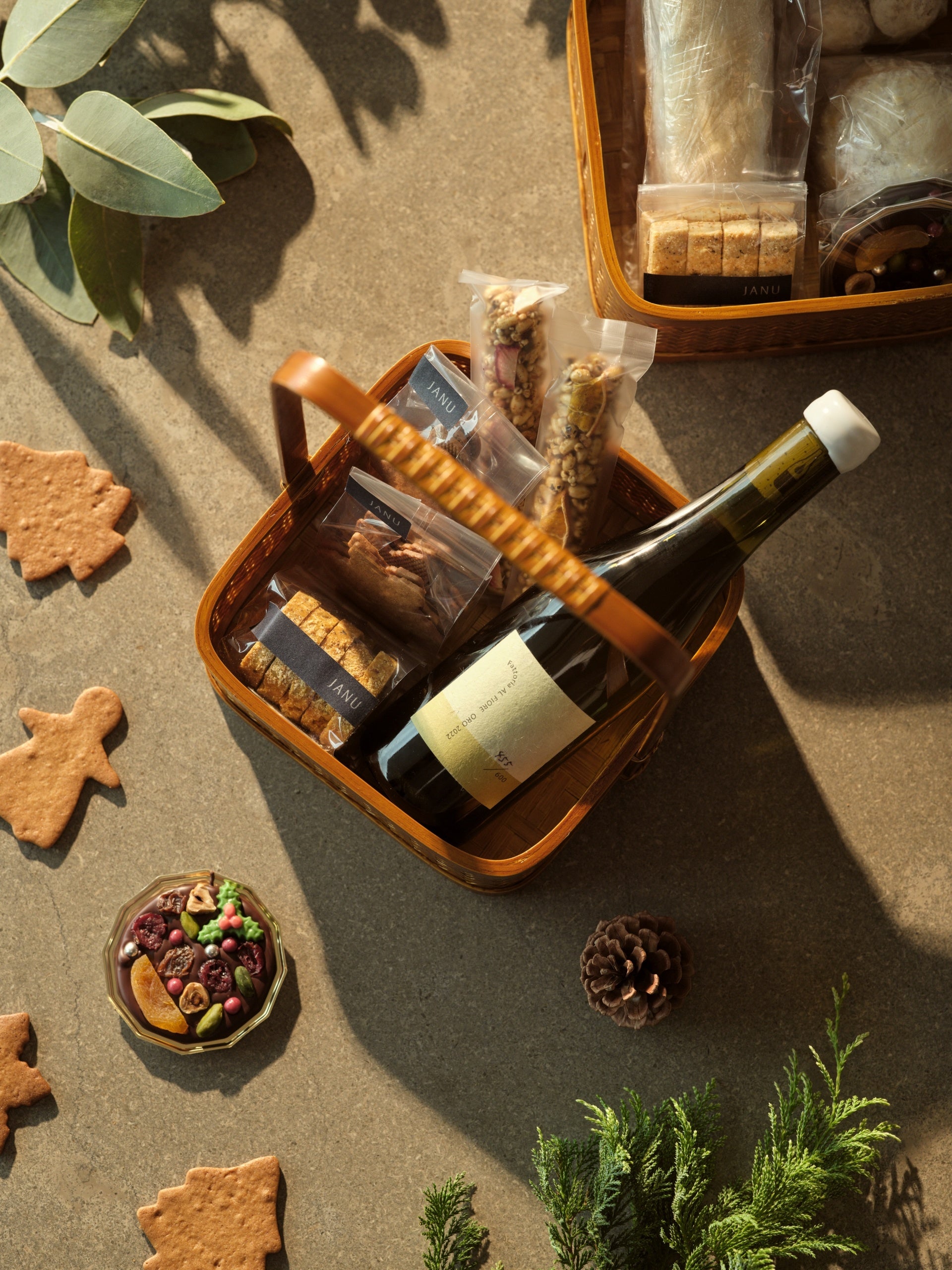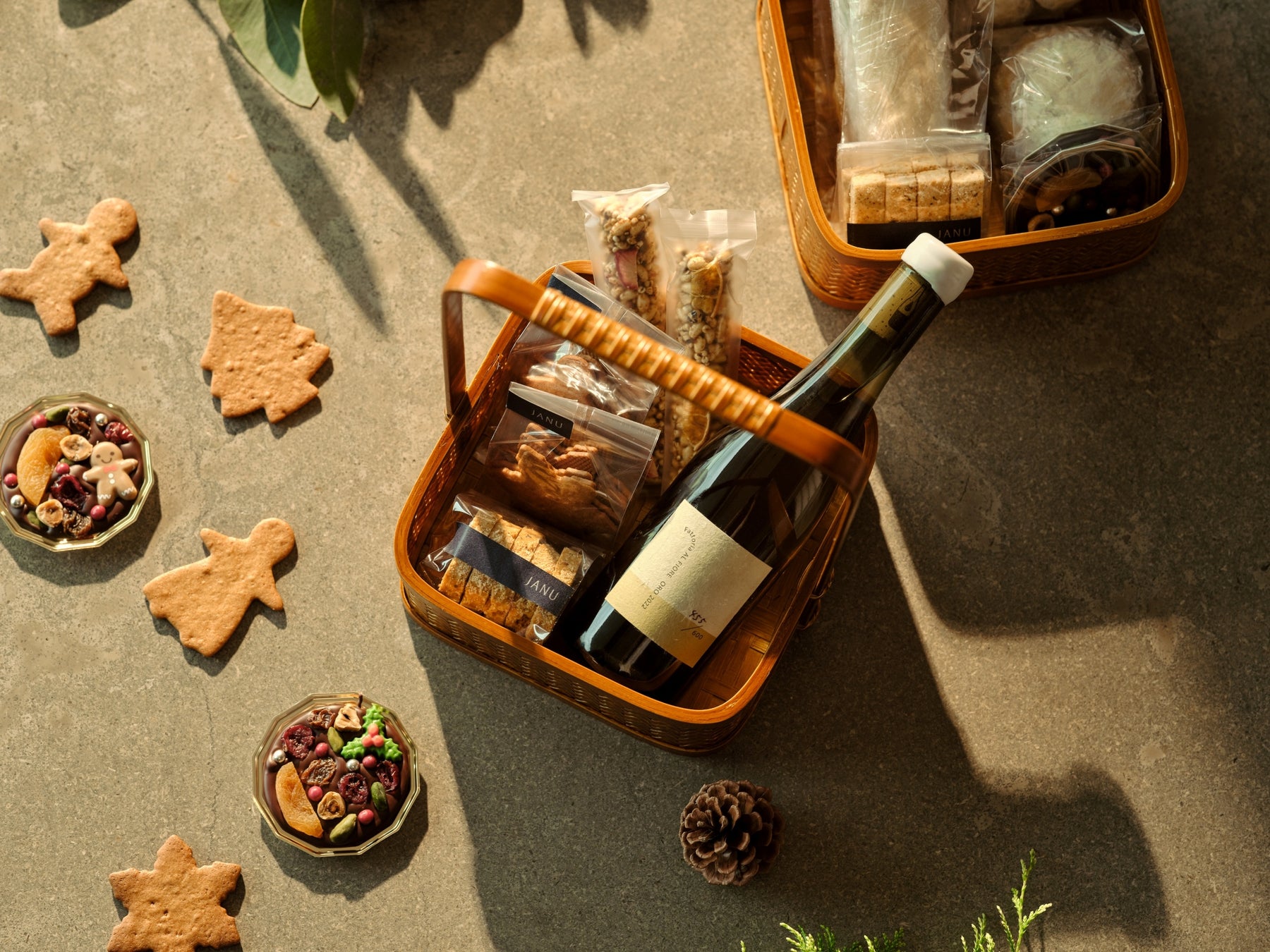 大切な方へのギフトに、ジャヌ パティスリーの『ホリデーハンパー2024』はいかがでしょうか。ジャヌ東京オープニングイヤーのハンパーには、「シュトーレン」、「ヴィーガンシュトーレン」、「ジンジャークッキー」、「タブレットショコラ」「ポン菓子」、「チーズ & ブラックペッパークッキー」と、ハーフボトルシャンパン*2またはジャヌ東京のシェフソムリエ 藤森達也がセレクトした赤白ワイン*3*4 、ジャヌ東京オリジナルジン*5とのアソートメントをご用意いたしました。