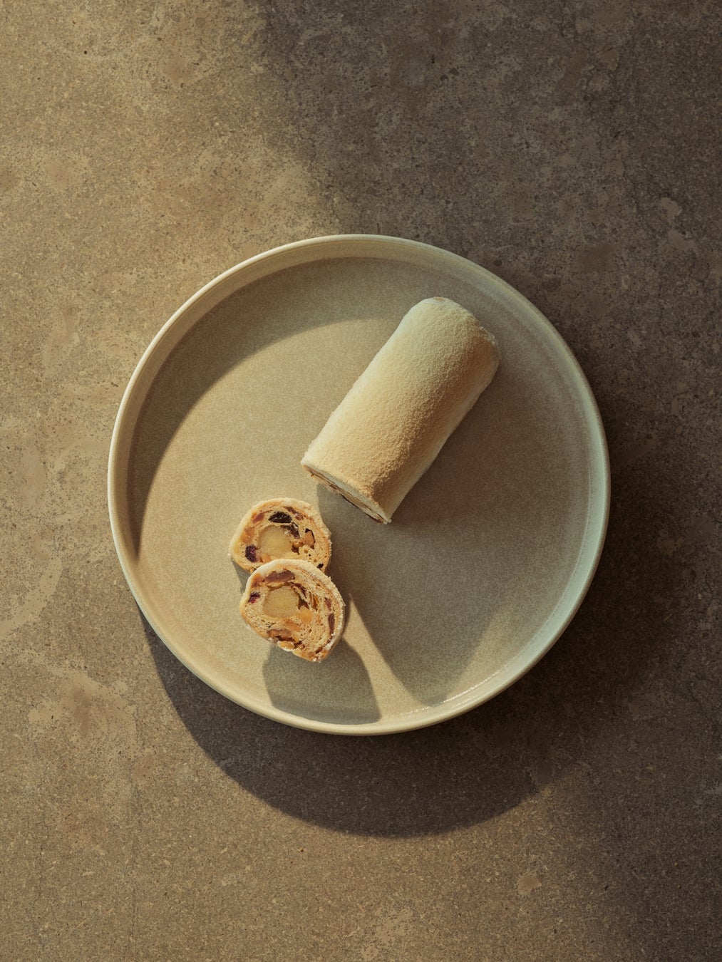 メープルスイーツコンテストでの優勝経験を持つ野口がご提案する『シュトーレン』は、メープルシロップとシナモンで漬け込んだクルミや、レーズン、クランベリー、アプリコットとイチジクを練り合わせた生地でマジパンを包み、焼き上げました。メープルの優しい甘さにバターとラム酒を効かせた、アドベント感が楽しめる、クリスマス定番のスイーツです。もうひとつのシュトーレン『ヴィーガンシュトーレン』は、動物性由来の食材を使わず、ドライフルーツに加え、甘納豆仕立ての大納言小豆を包み込み、和三盆でコーティングいたしました。見た目にも可愛い丸いシュトーレンは、和を感じさせる一品です。