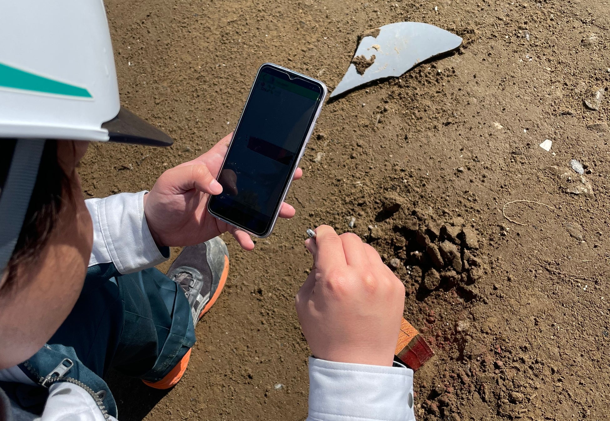 従来の杭位置の確認は通常2人1組で取り組んでいましたが、杭位置確認ツール活用により1人での確認作業が可能になりました。