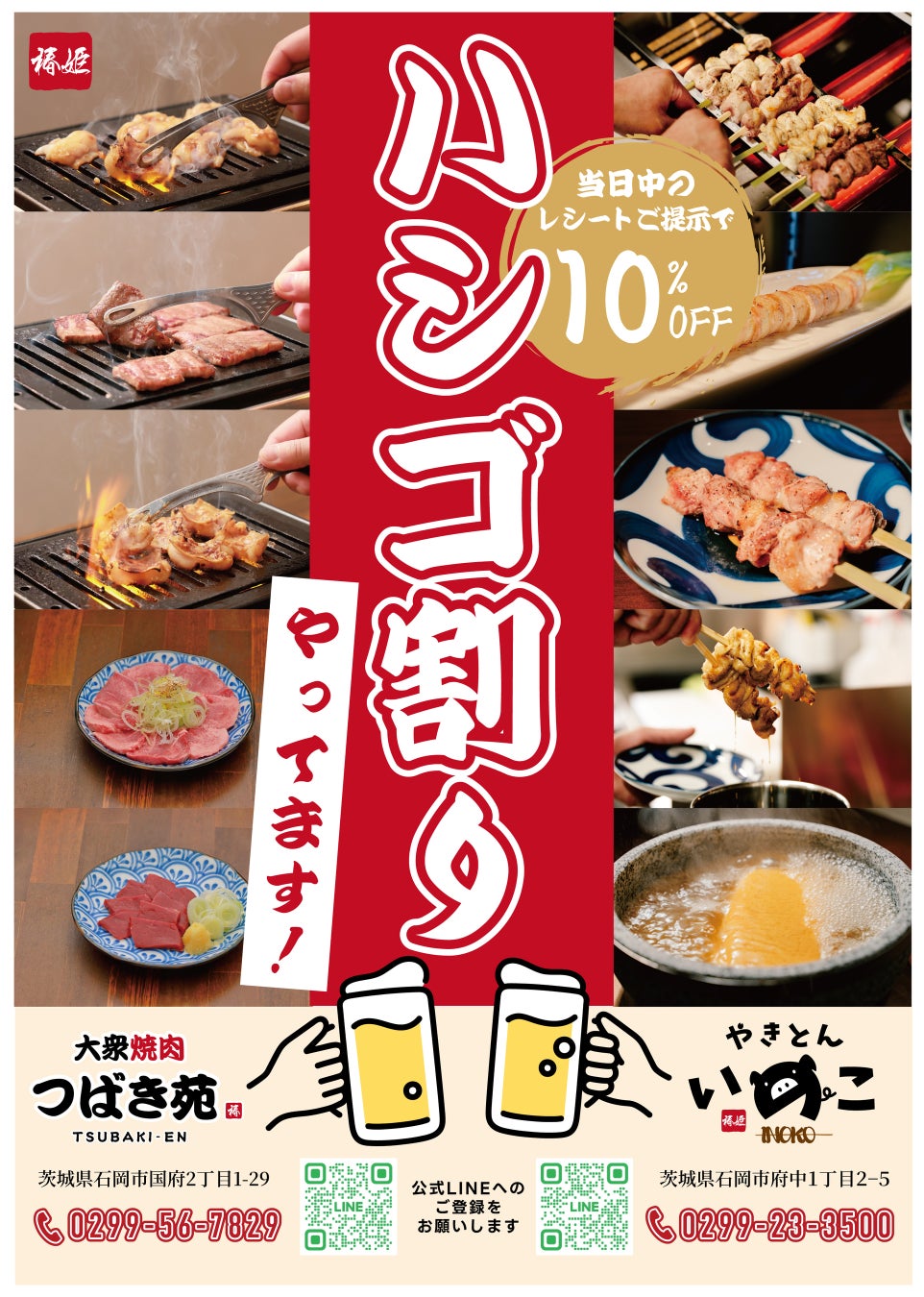 忘新年会で欠かせない二次会・・・お店選びも難しいですよね?大衆焼肉つばき苑とやきとんいのこでは、現在「ハシゴ割り」を実施中です!どちらかの店舗の当日中のレシートをご提示いただくと、2店舗目のお会計から10%割引させていただきます。