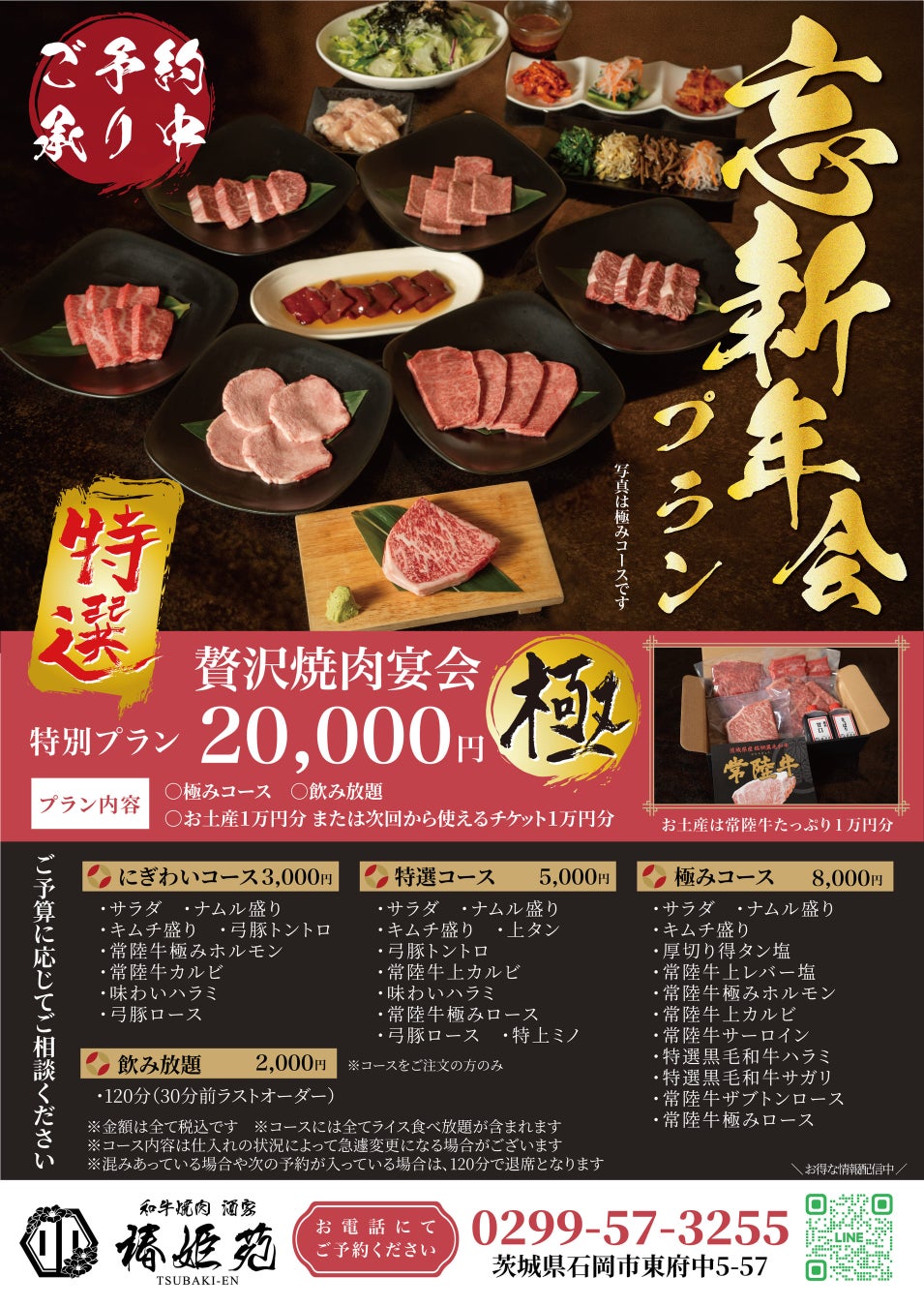 株式会社椿姫苑(代表:小林礼、本社:茨城県石岡市)は、「和牛焼肉酒家 椿姫苑」「大衆焼肉つばき苑」「やきとんいのこ」の3店舗で、11/20(水)より忘新年会の予約受付を開始します。