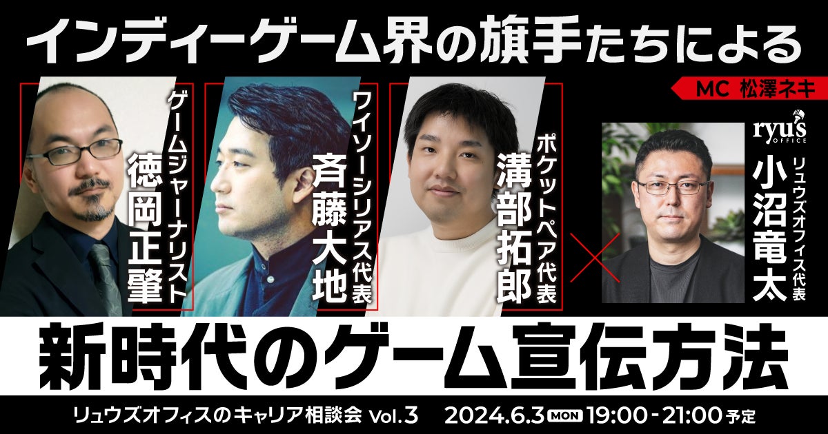 株式会社リュウズオフィス代表の小沼が「新時代のゲーム宣伝方法」を題材に、リュウズオフィスの「企画」の仕事術について、インディーゲーム界の旗手たちとトークセッションを行います。