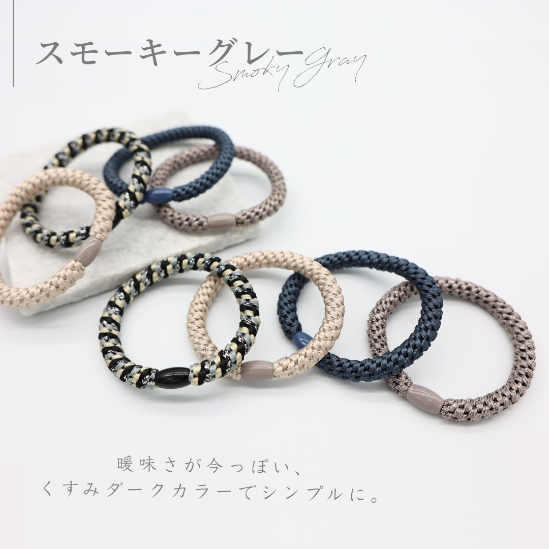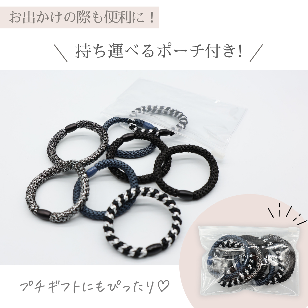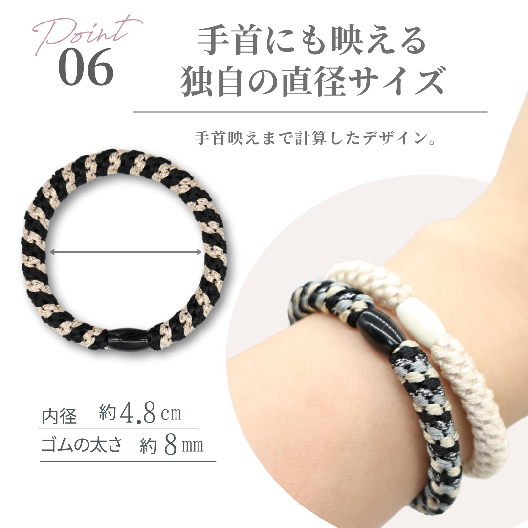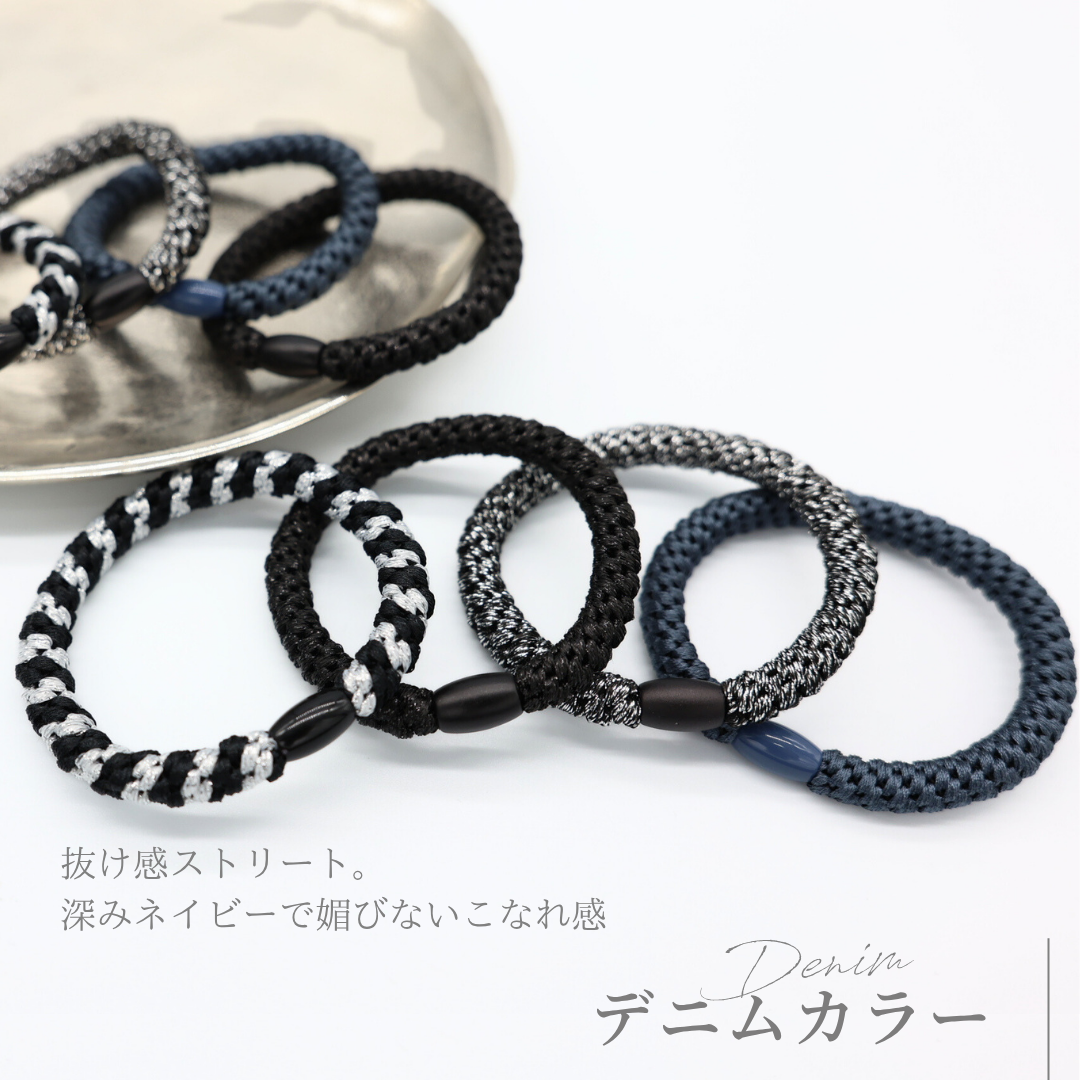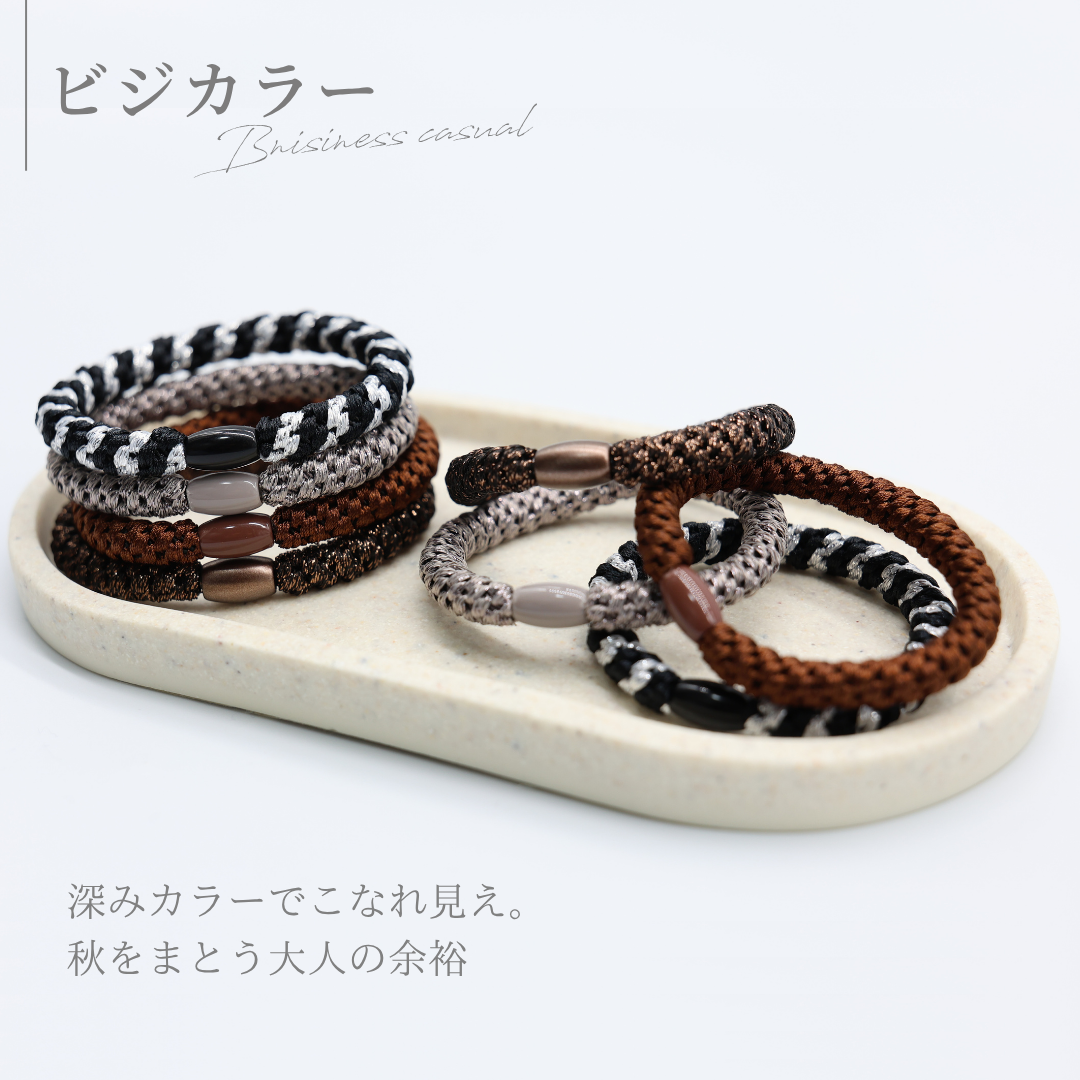 「黒いだけのゴムじゃ物足りない」そんな方に向けて、光沢糸やラメを織り込んだ絶妙カラーをセレクト。ただ結ぶだけでスタイルが決まり、腕につければアクセサリー感覚でも楽しめます。