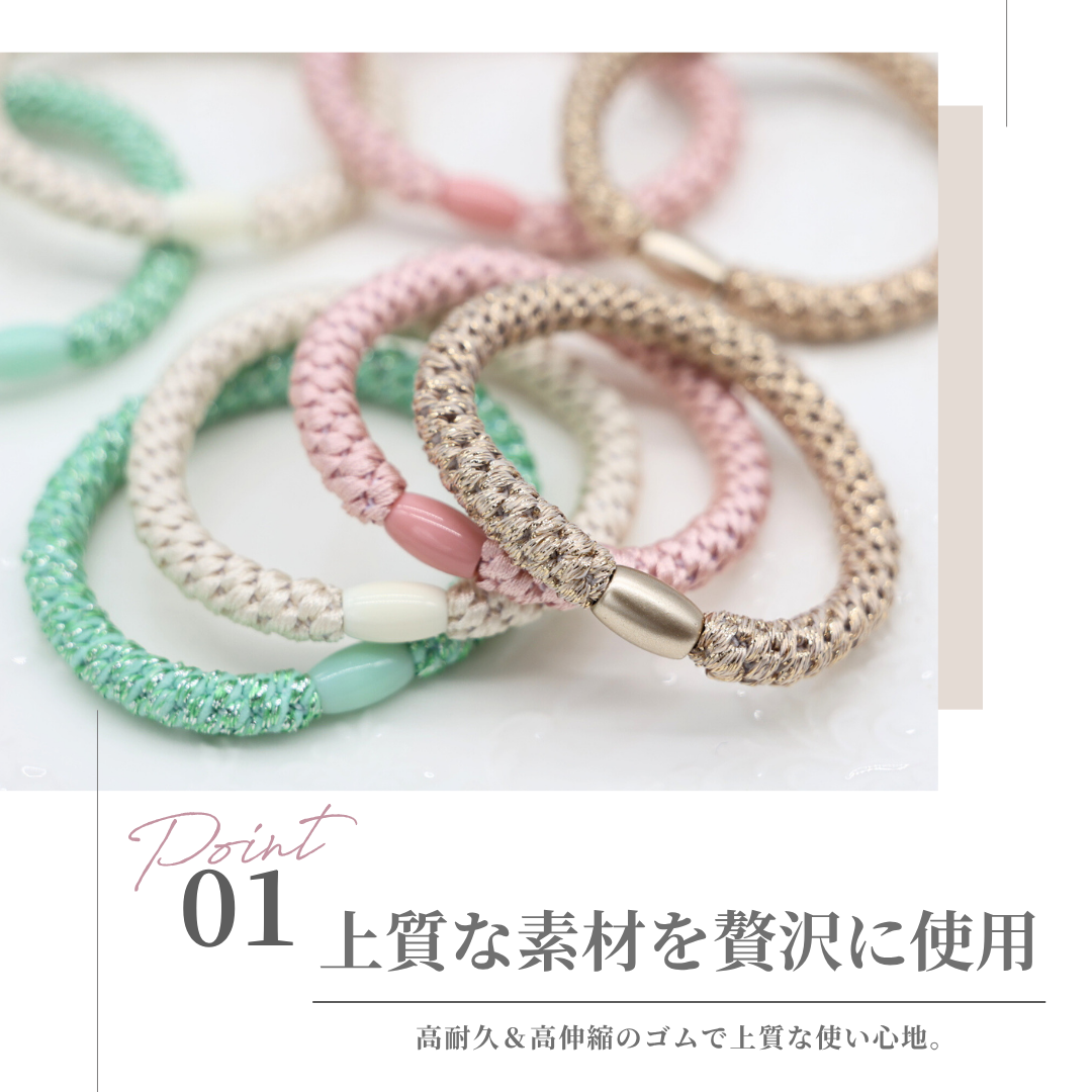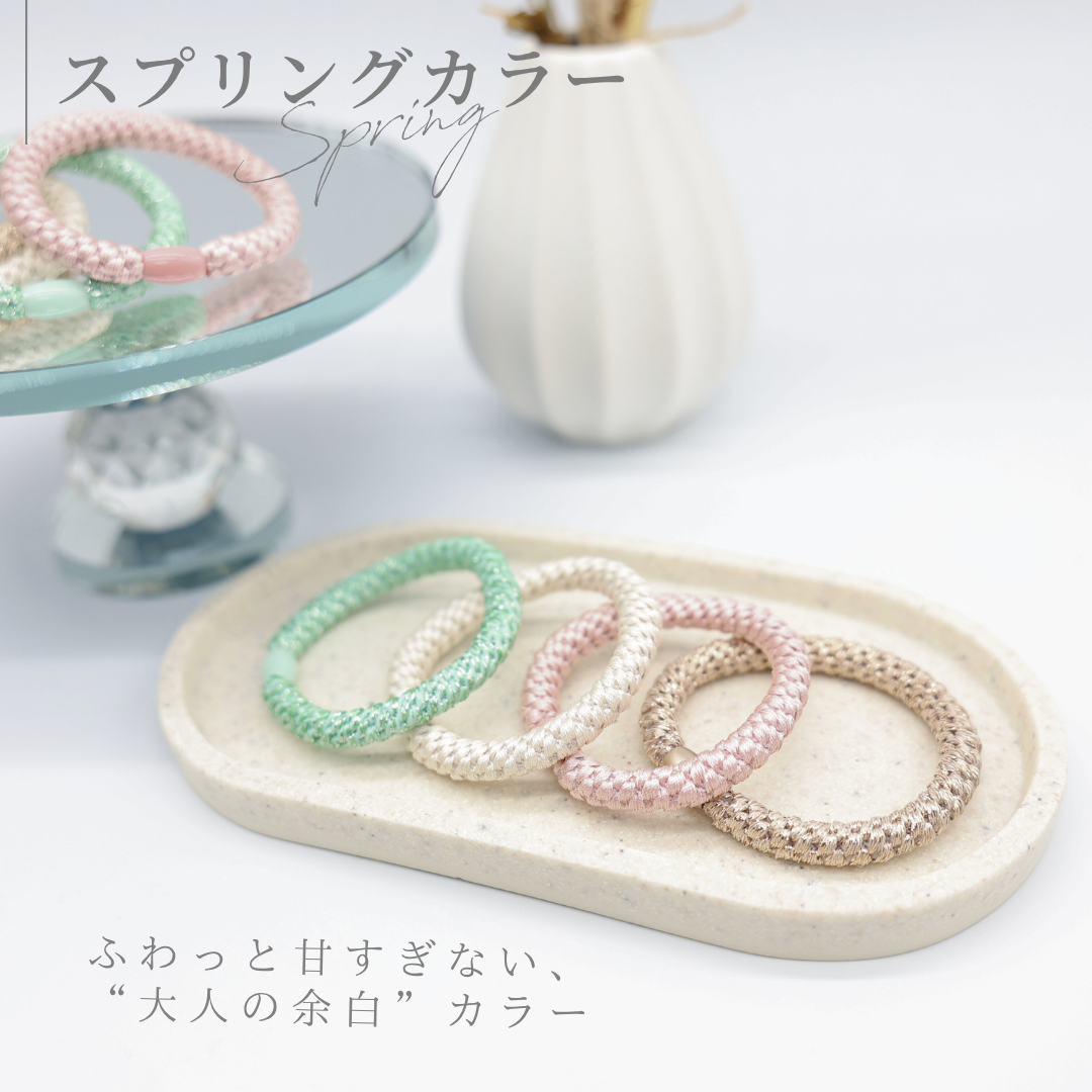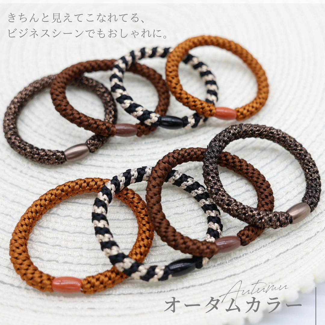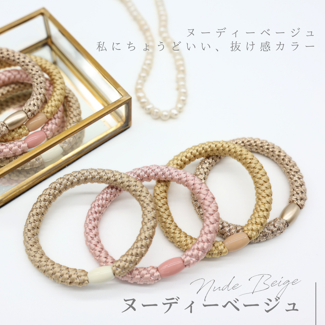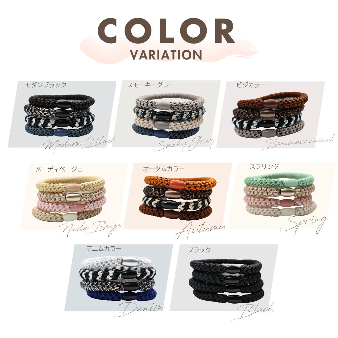 「黒いだけのゴムじゃ物足りない」そんな方に向けて、光沢糸やラメを織り込んだ絶妙カラーをセレクト。ただ結ぶだけでスタイルが決まり、腕につければアクセサリー感覚でも楽しめます。