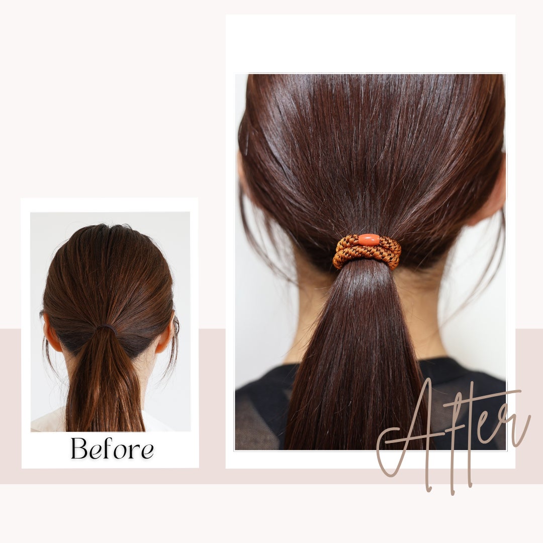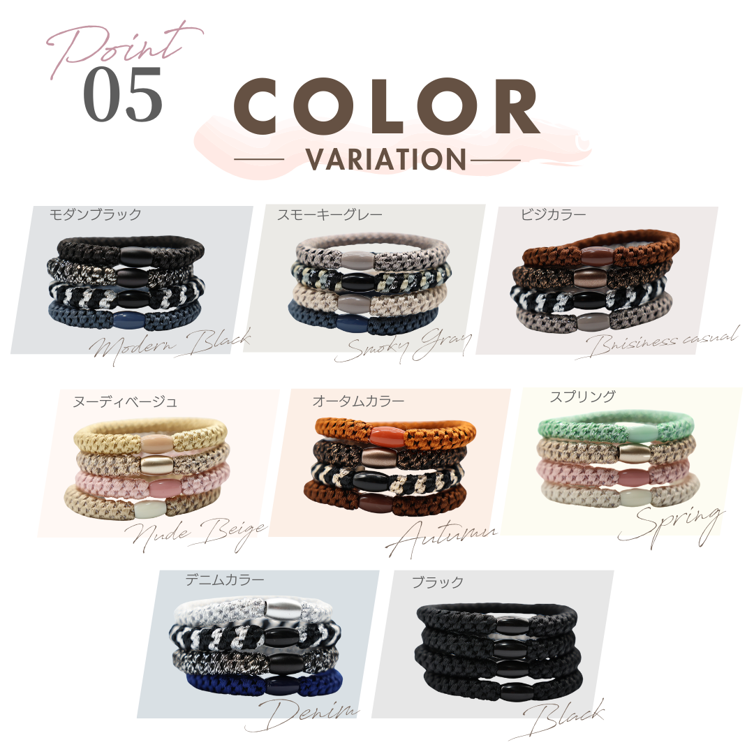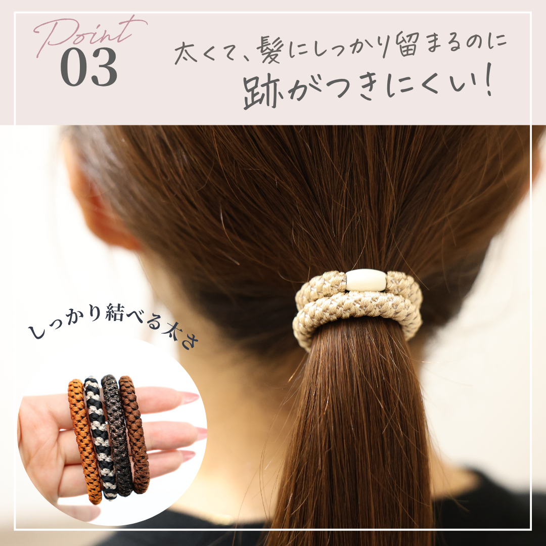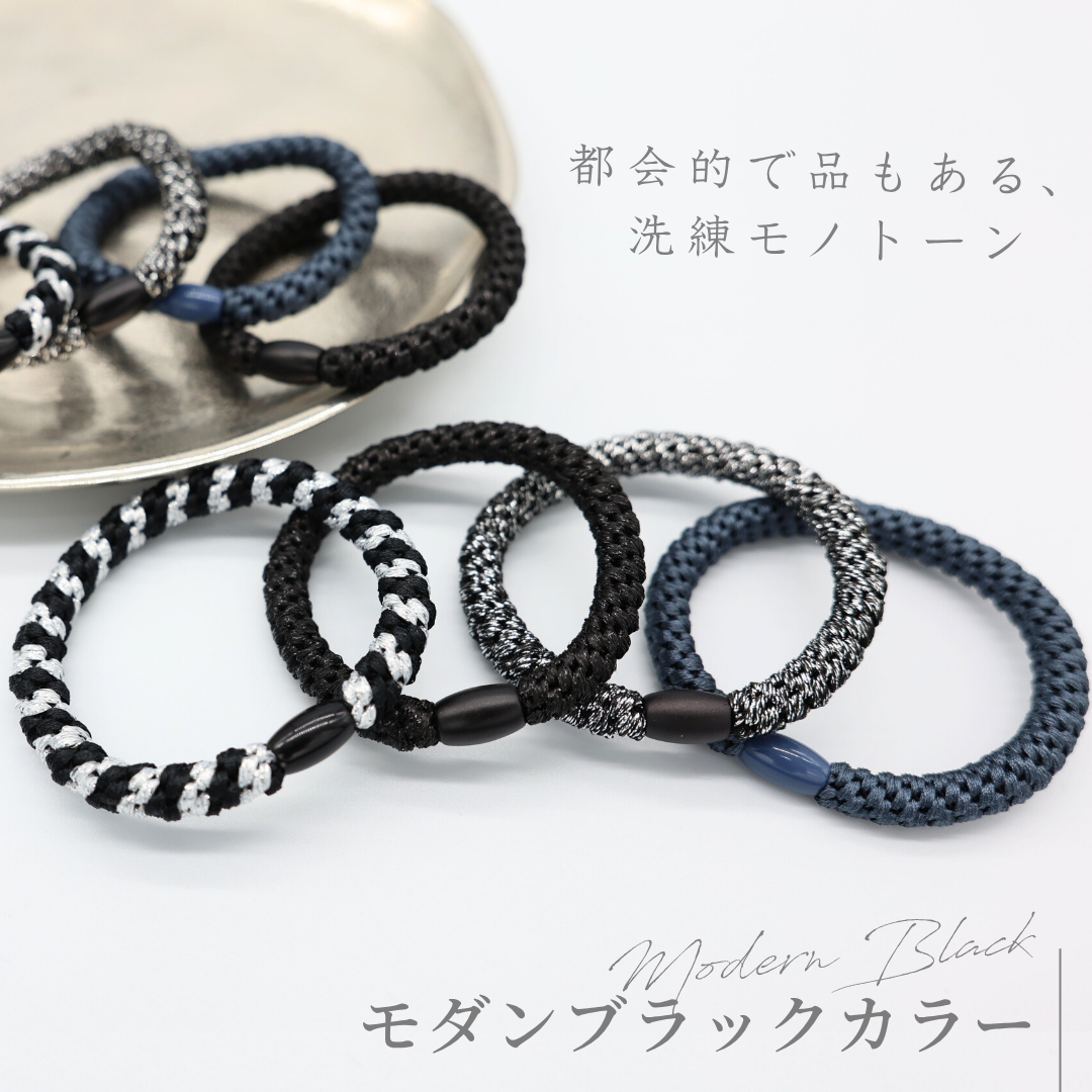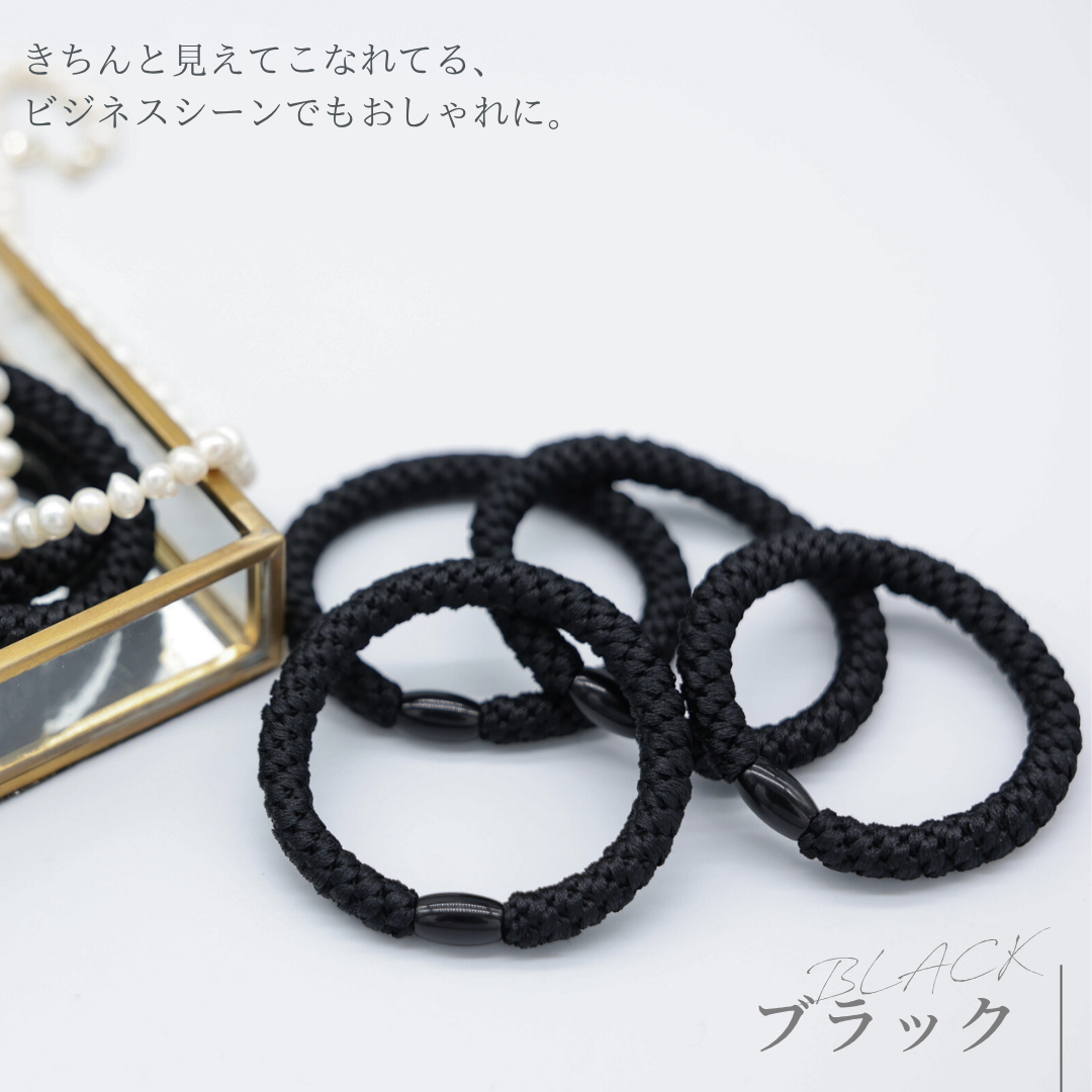 「黒いだけのゴムじゃ物足りない」そんな方に向けて、光沢糸やラメを織り込んだ絶妙カラーをセレクト。ただ結ぶだけでスタイルが決まり、腕につければアクセサリー感覚でも楽しめます。