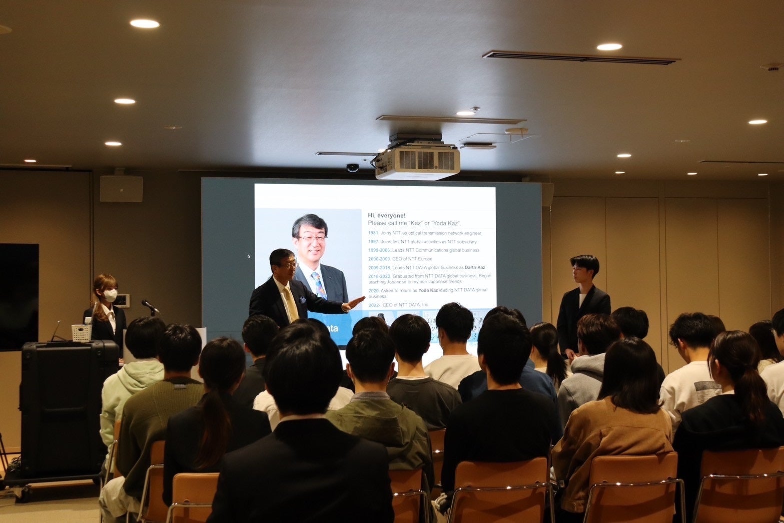 今回のテーマは「NTT DATAとグローバル人材とは」で、社長である西畑様に、NTT DATAについて学生たちに紹介していただき、西畑様自身が仕事をする上で大切にされてきたことについても語っていただきました。