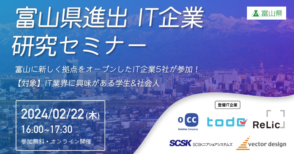 富山県(運営:株式会社Asian Bridge)は、IT業界に興味のある若者や地域の方に、県外から富山へ進出したばかりのIT企業5社のことをより知ってもらうため、進出IT企業研究セミナーを開催します。