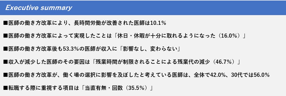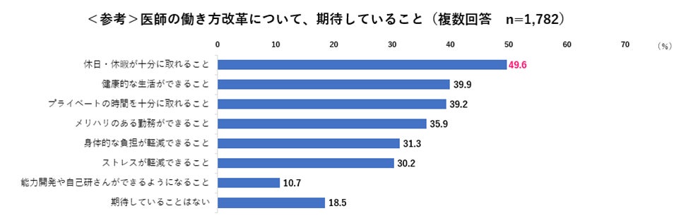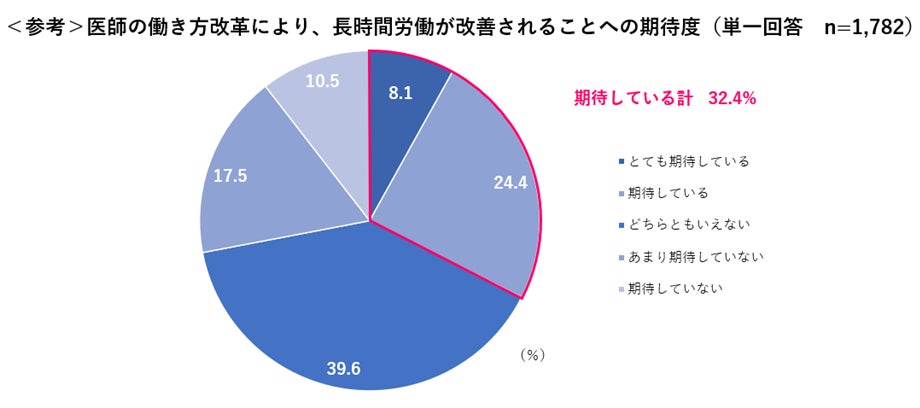 2023年10月に行った医師の働き方改革が施行される前の調査では、長時間労働の改善に期待すると答えた医師は32.4%でしたが、今回の結果からはまだ改善には至っていない様子がうかがえます。