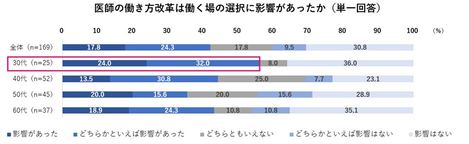 また、医師の働き方改革が職場選びに影響があったか聞いたところ、「影響があった」「どちらかといえば影響があった」の合計は42.0%でした。年代別で見ると30代では56.0%と、全体の回答割合より高く、若手医師の方が職場選択において働き方改革の影響を受けている傾向が分かりました。
