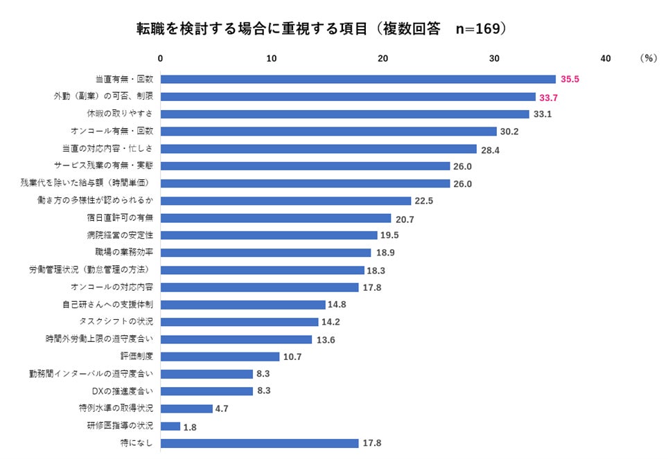 今後転職する際に重視する項目としては「当直有無・回数(35.5%)」、「外勤(副業)の可否、制限(33.7%)」「休暇の取りやすさ(33.1%)」が上位となり、働き方改革によって重視するポイントに変化が見られています。