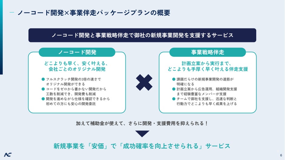 フルスクラッチのわずか1/3の費用で開発できるノーコード開発に加えて、本プランで補助金を活用することができれば、通常のフルスクラッチ開発・事業開発の1/4以下の金額で開発を行うことが可能になります。
