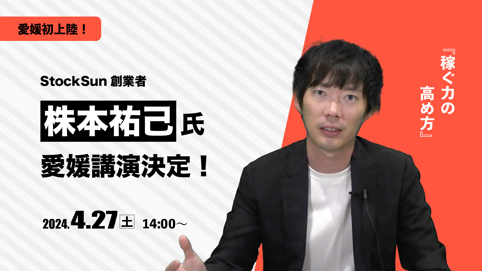 令和の虎や年収チャンネルで人気のStockSun創業者である株本祐己氏をゲストに迎え、ビジネスやキャリアに関する講演を愛媛県・松山市の愛媛県県民文化会館サブホールにて開催いたします。【4月27日】