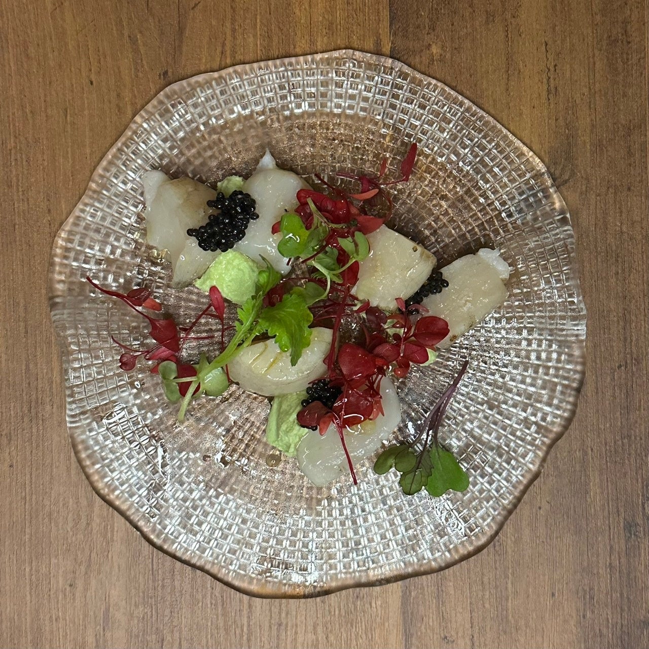 帆立を超高温の薪火で炙り急速に冷やした物と京都の枝豆を使った軽いずんだを合わせた夏らしい1品