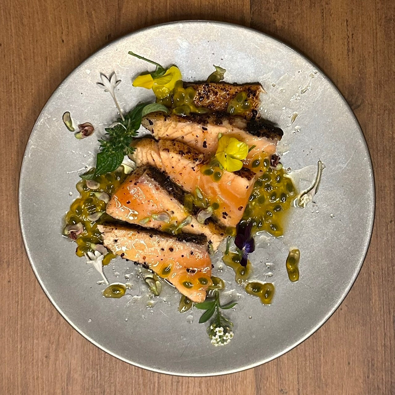 最高のサーモンを独自のスパイスでマリネし一瞬で薪火でタタキにしフレッシュなパッションフルーツと上質な塩のみで合わせたシェフオススメの1品