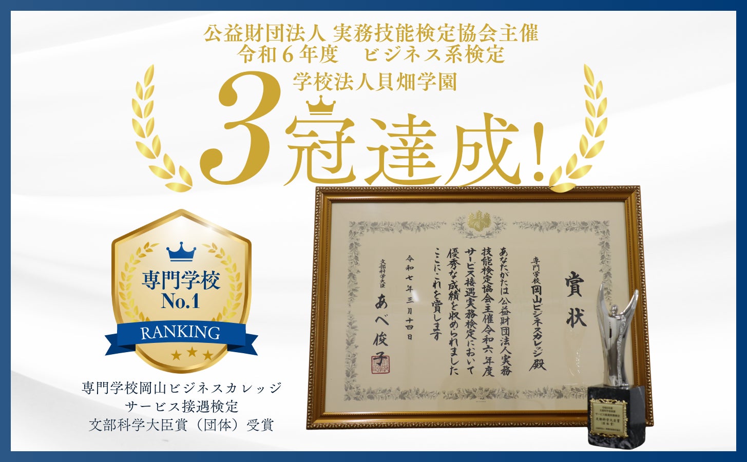 【全国トップの快挙&貝畑学園で3冠達成】専門学校岡山ビジネスカレッジが令和6年度「サービス接遇検定」文部科学大臣賞(団体)を受賞しました