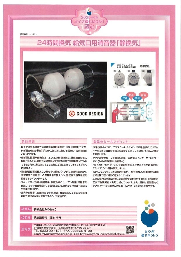 株式会社みやちゅう(代表取締役 菊池圭吾 本社:仙台市若林区)では、「第17回みやぎ優れMONO」 (主催:みやぎ優れ MONO 発信事業実行委員会)にて、住宅の給気口用消音器「静換気(しずかんき)」が認定されました。「みやぎ優れMONO」 とは、宮城県内の優れた工業製品を認定し、県内外に発信するための認定制度で、平成21年6月に創設されました。 認定企業並びに認定を目指す企業への技術、販売、経営等に係る様々な支援を行い、宮城県から数多くのものづくりヒット商品を生み出すことを目的としているものです。
