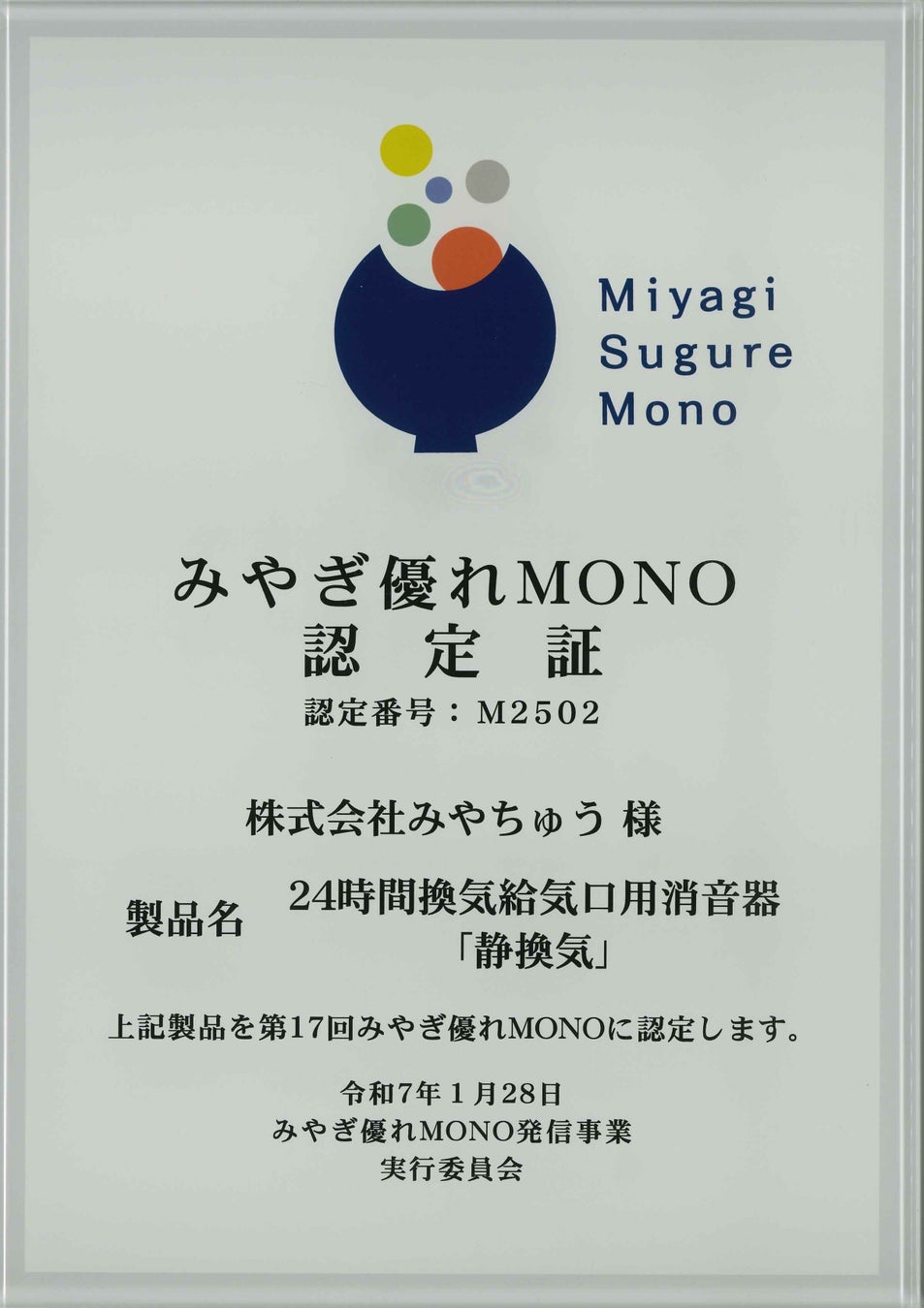 この度は弊社製品の住宅給気口用消音器「静換気(しずかんき)」を「第17回みやぎ優れMONO」にご認定頂き誠にありがとうございます。数ある素晴らしい製品の中で「静換気(しずかんき)」をご認定頂いたこと、また、昨年の「天井制振材」に続いて二年連続のご認定となりましたこと素直にうれしく思います。弊社は「Made in みやぎ」をコンセプトにして県内サプライヤーの皆様にご協力いただき製品の開発を行っておりますが、製品化については皆様のお力添えが無ければ不可能であり、この度のご認定は弊社1社ではなくチーム全体の結束の結果だと感じています。この場を借りて関係者様に深く御礼申し上げます。ありがとうございました。