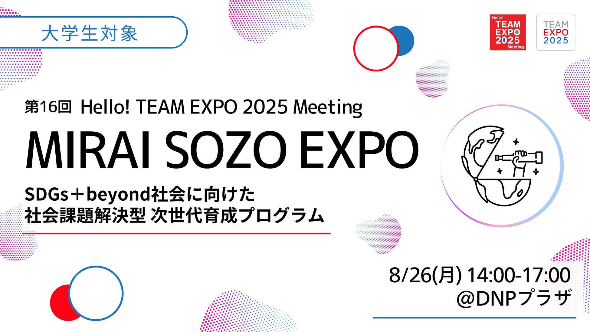 この度は、公益社団法人2025年日本国際博覧会協会・大阪商工会議所・大日本印刷株式会社が共催されている、「Hello! TEAM EXPO 2025 Meeting」と連携し、SDGs+beyond社会に向けた社会課題解決型 次世代育成プログラム “MIRAI SOZO EXPO”を企画・開催いたします。