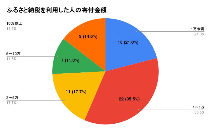ふるさと納税を利用した62名に対し、寄付金額に関する結果は以下の通りです。