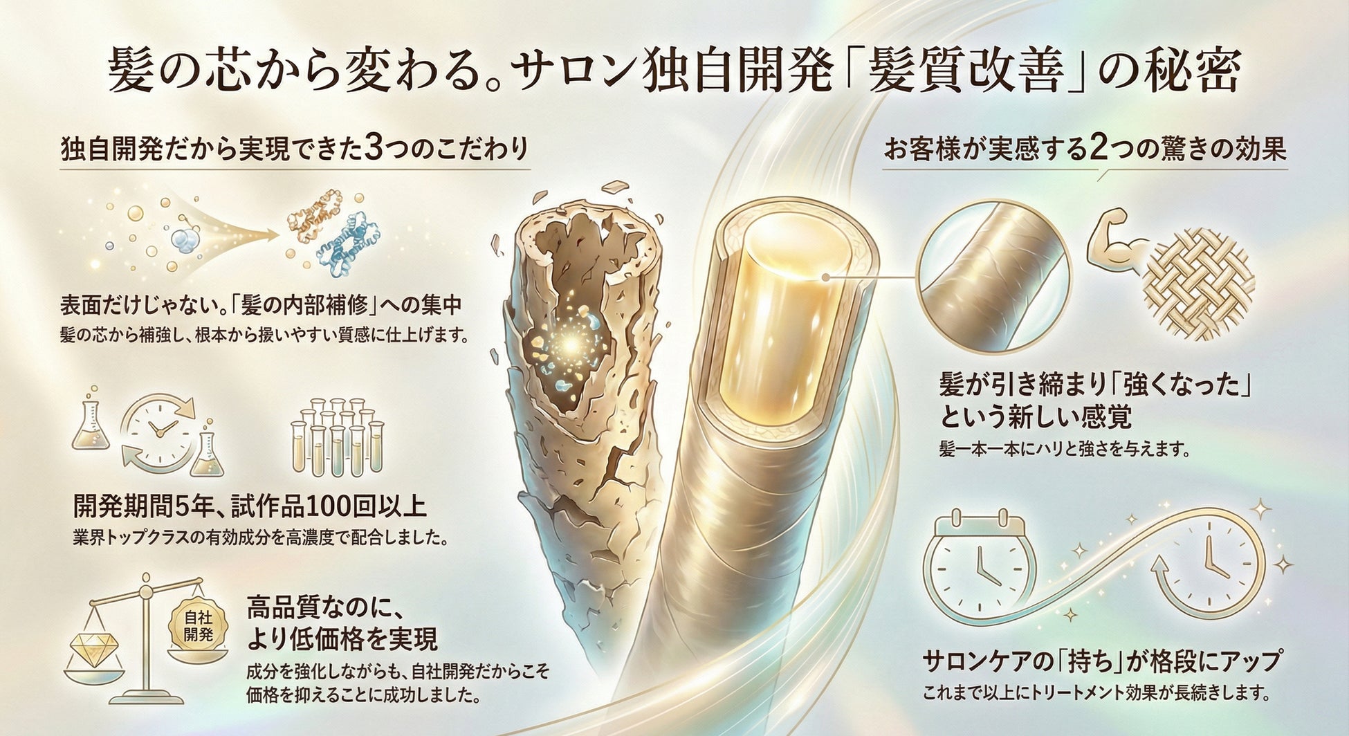 KUSELESSは「高価で時間がかかる髪質改善」を、通いやすい価格と時間で提供することで、特別なご褒美ではなく“毎月続けられる習慣”へと変えることを目指しております。
