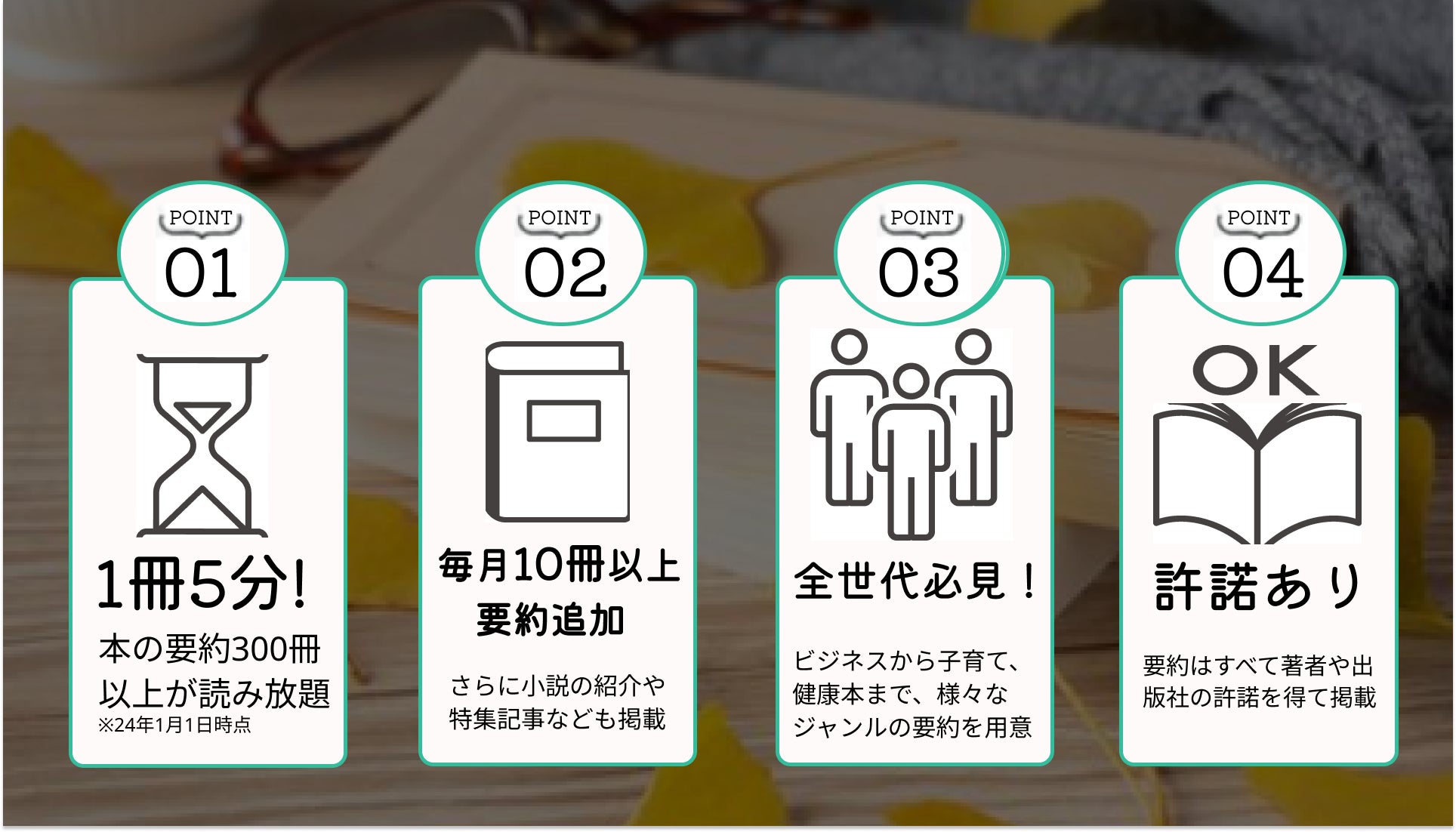 2024年1月1日にサービスを開始し、公開時の300冊に加え、毎月10冊以上の本の要約が追加されます。