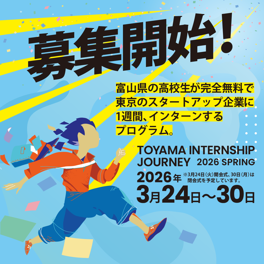 富山県在住の高校生を対象とした特別プログラム「富山インターンシップジャーニー」が、今年も開催され ます。東京のスタートアップ企業での1週間の無料インターンシップを提供する本プログラムは、これまで に2回開催され、累計22名の高校生が参加。プログラムを終えた参加者からは「自分の可能性が広がった」 「やりたいことが見つかった」といった声が寄せられています。