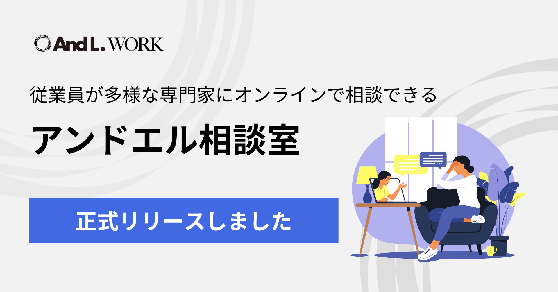 アンドエル株式会社(本社:東京都港区、代表取締役:古橋 智史、以下「アンドエル」)は、法人向け健康支援サービス「アンドエルワーク」の新機能として、従業員が多様な専門家にオンラインで相談できる 「アンドエル相談室」を正式に開設いたしました。