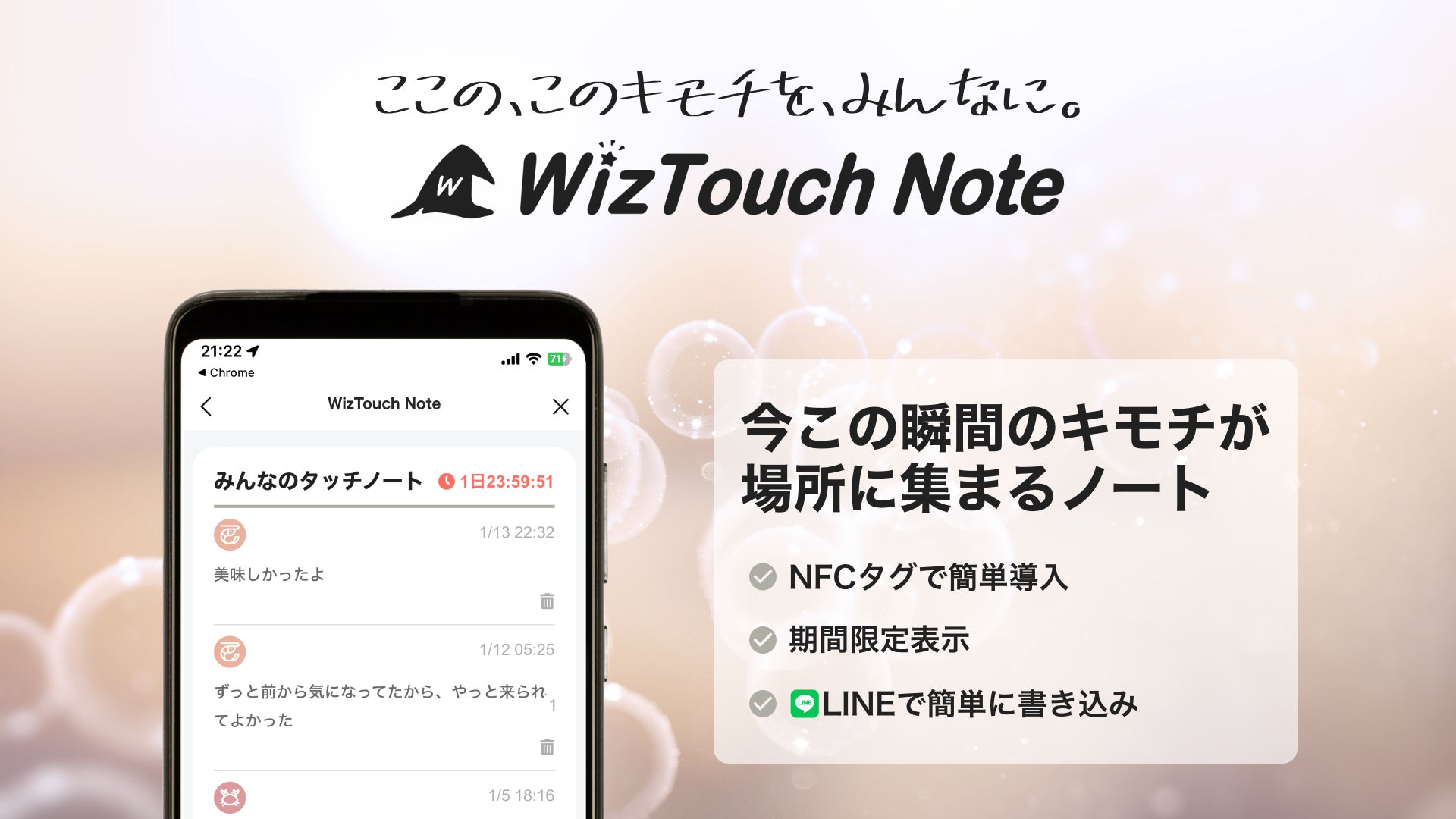WizTouch Note(ウィズタッチノート)は、飲食店、ショップ、スタジアム、美術館、イベント会場など、さまざまなスポットにあるタッチノートに、今この瞬間のキモチを書き残すためのサービスです。書き込みや閲覧ができるのは、その場所を訪れた人だけ。その瞬間のキモチを大切にして、同じ場所を訪れた人だから共感できる、街のノートをコンセプトにしています。