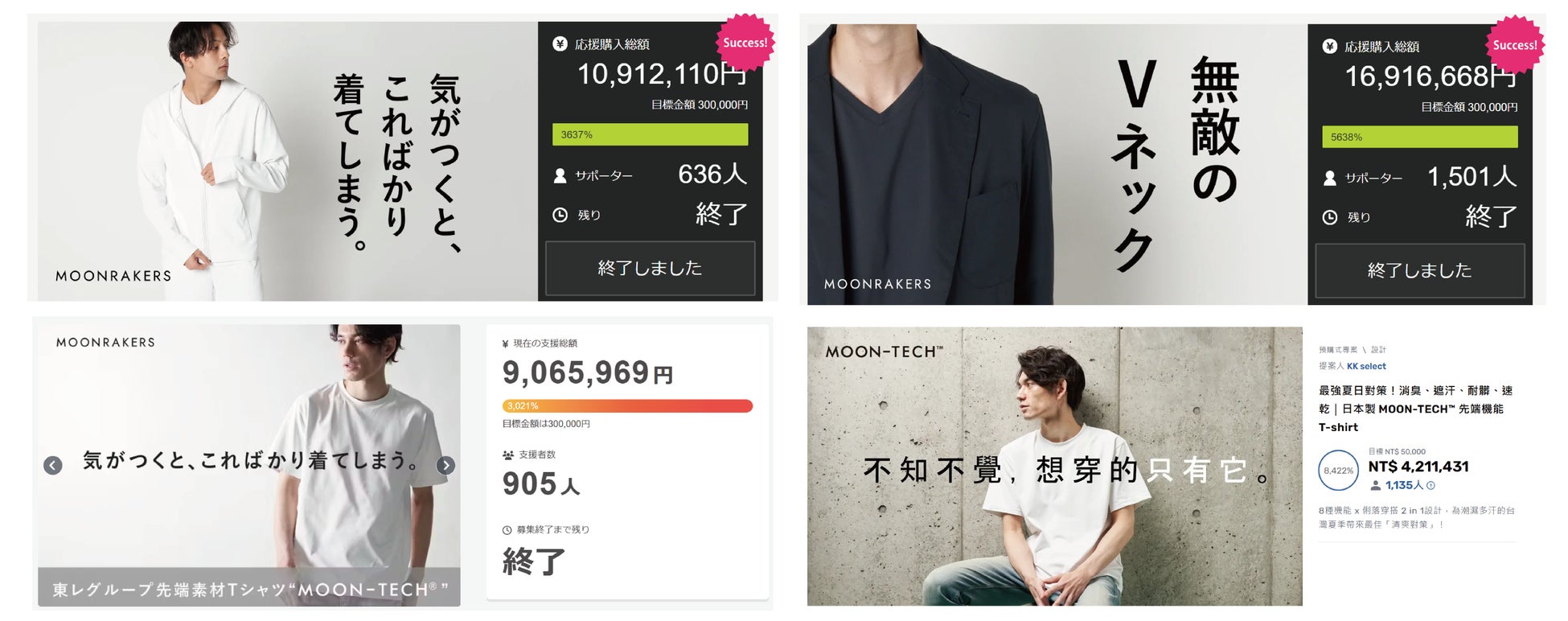 その第一弾となるプロダクト、「優れた普通|MOON-TECH®PILE SETUP(ムーンテック®パイル セットアップ)」を応援購入サービス「Makuake」でリリースしたところ、初日売上・総合ランキング1位を獲得し、現在、開始から約10日間で、300名を超える多くの方々からの応援購入を受け、目標金額の2000%超の600万円超えという大きな反響を呼んでいます。