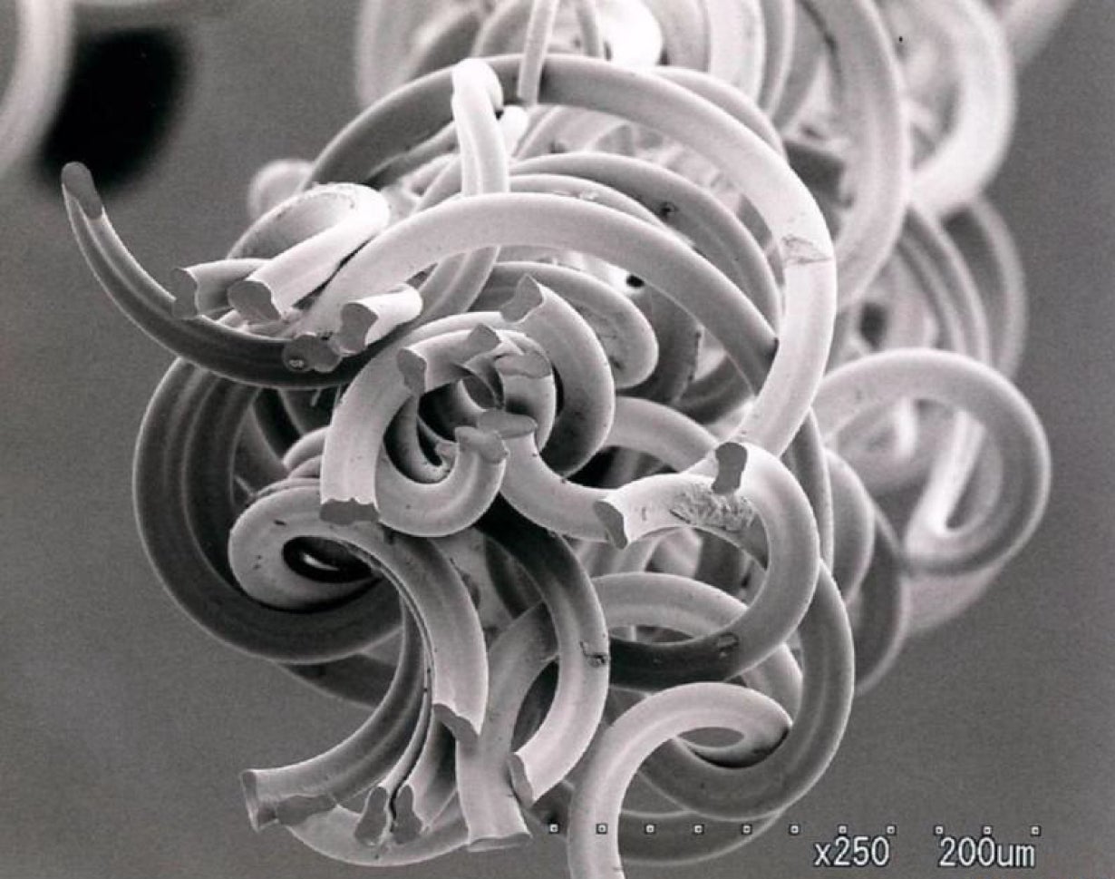 また、上記繊維と高いストレッチ性、ナチュラルな質感、柔らかな触感を発現するポリエステルとポリトリメチレンテレフタレートを1本の繊維の中で張り合わせスパイラル捲縮を発現する特殊原糸を複合し、高いストレッチ性を持ちながら劣化の少ないタフな高耐久性も実現。
