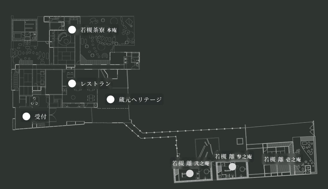 また本庵の他には、敷地内に土蔵や別邸を改装した「離」の3室と、津和野ガストロノミーレストラン「若槻茶寮」を併設しています。離は、専有庭やプライベートサウナなどの快適な空間を設えている「壱乃庵」と、土蔵二棟をそれぞれ改装しプライベートな空間に仕上げた「弐乃庵」「参乃庵」からなります。
