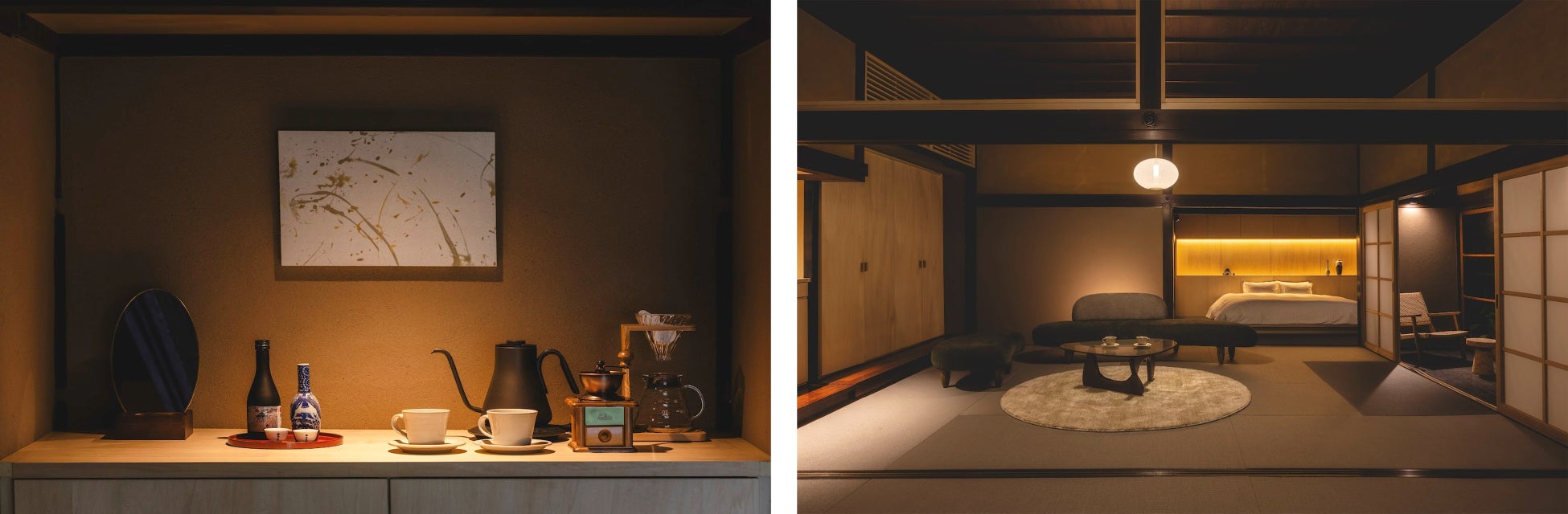 専有庭を2つ備え、300㎡を超えるメインの部屋。無響室や、専有庭にある土蔵を一棟改装した温浴設備の胎内浴を配し、再生をテーマとした五感没入体験を提供