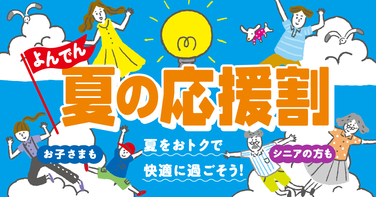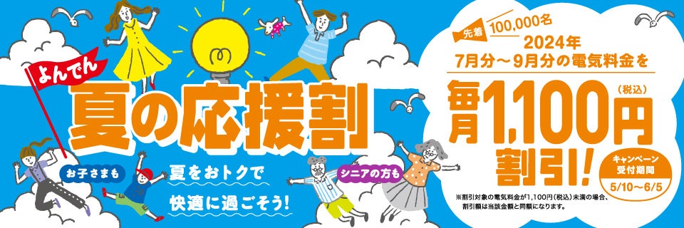 今夏については、より多くのお客さまの暮らしを応援できるよう、対象世帯を拡大し、「よんでん夏の応援割」キャンペーンを実施することとしましたので、お知らせいたします。