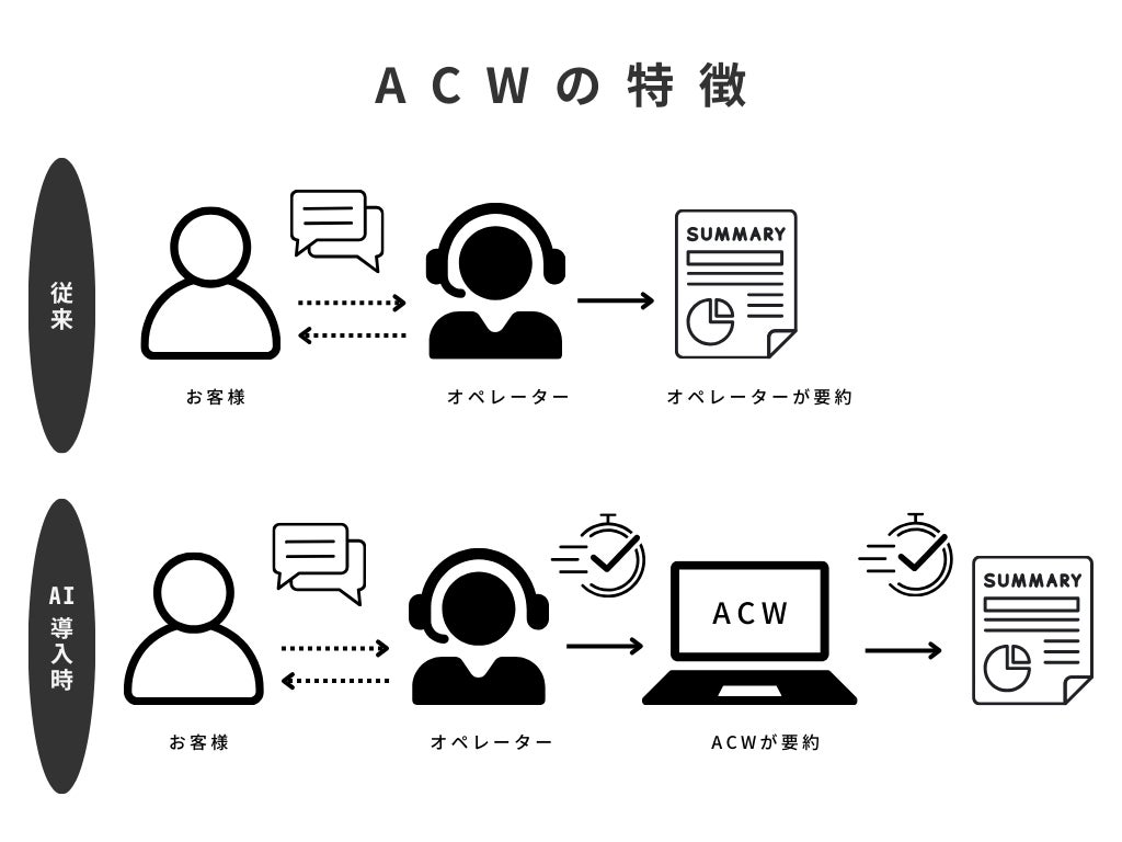 アフターコールワーク(以下ACW)は、顧客との電話が終了した後、担当者がその会話内容を記録し、必要な作業をまとめるためにかかる時間を指します。
