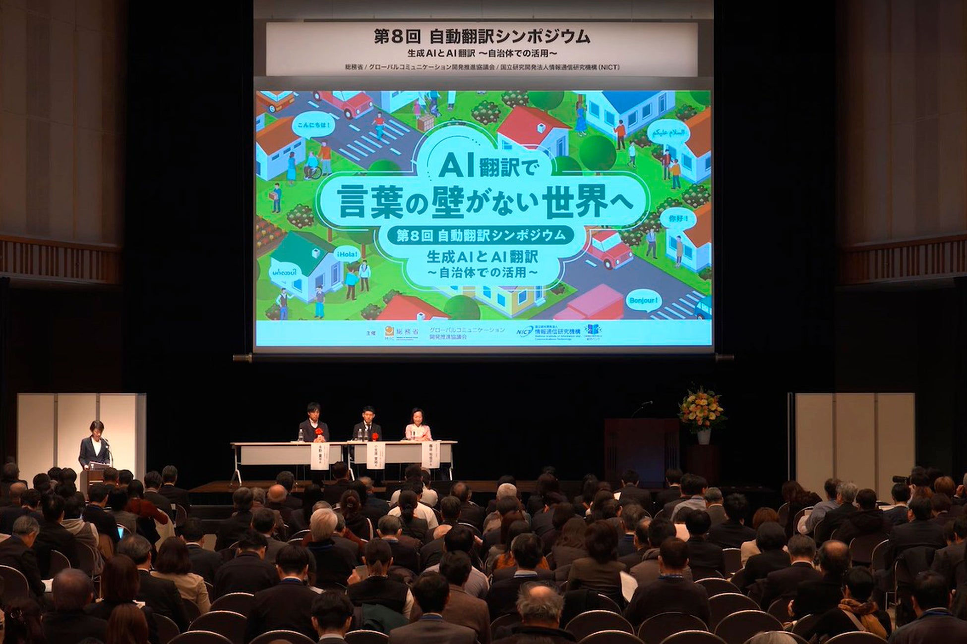 2025年2月19日(水)、総務省、国立研究開発法人情報通信研究機構(NICT)及びグローバルコミュニケーション開発推進協議会は、「生成AIとAI翻訳 ~自治体での活用~」をテーマに、8回目となる「自動翻訳シンポジウム」を品川インターシティホールにて開催しました。当日は422名が参加し、研究者による最新の技術動向や、開発メーカーによる、各自治体での自動翻訳機器・サービスの活用に関する講演や、22者の企業・団体による最新の自動翻訳製品・サービス等の展示が行われました。