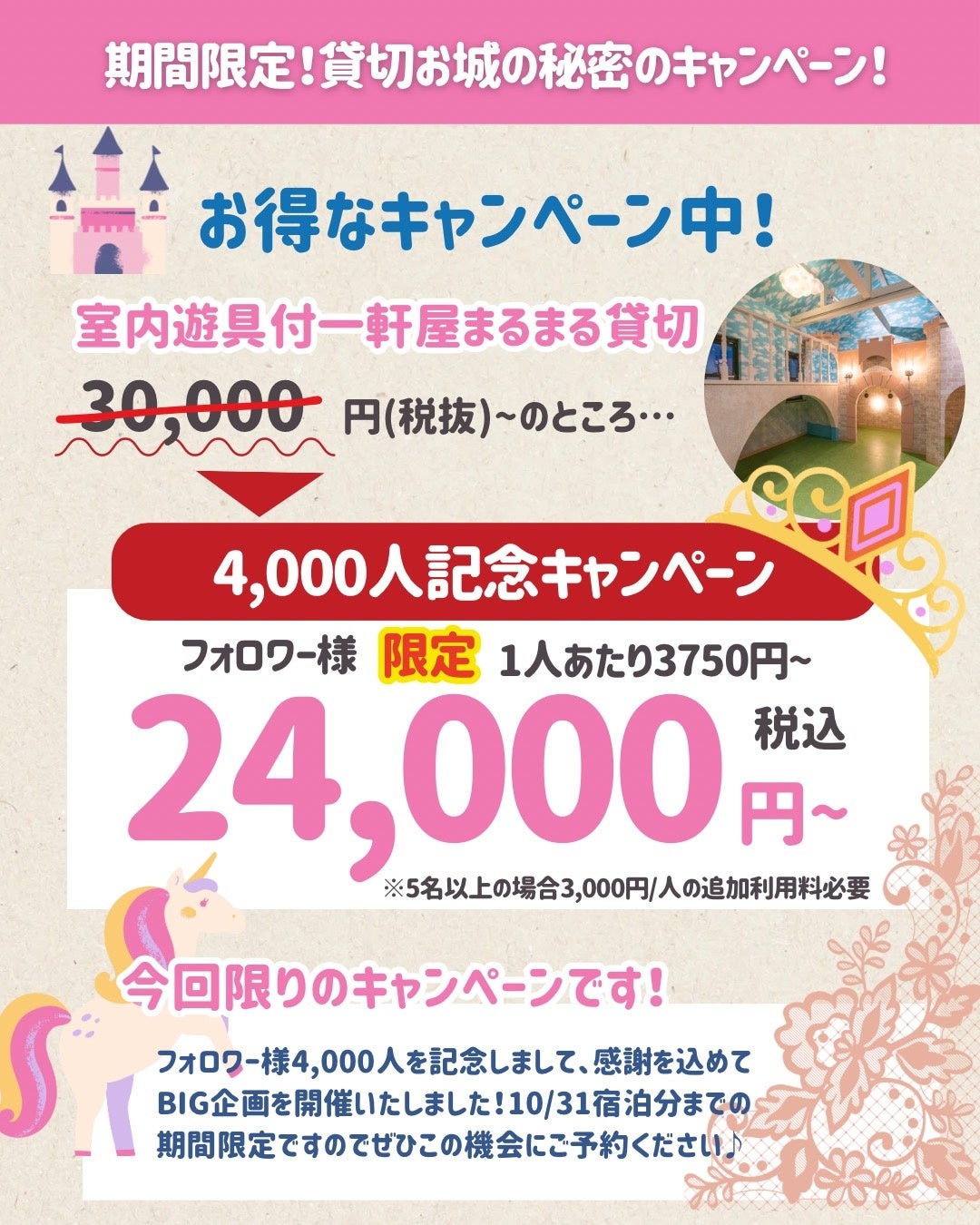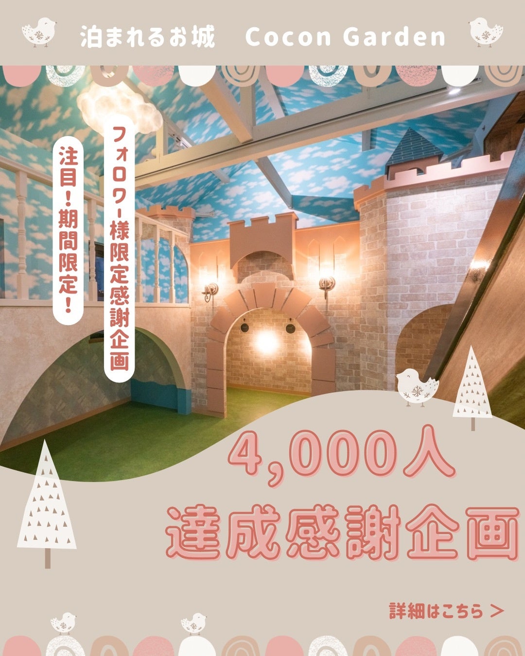 【子連れホテル】家族で楽しむ室内遊び場完備★夢の泊まれるお城♪フォロワー4,000人記念BIG企画開催!