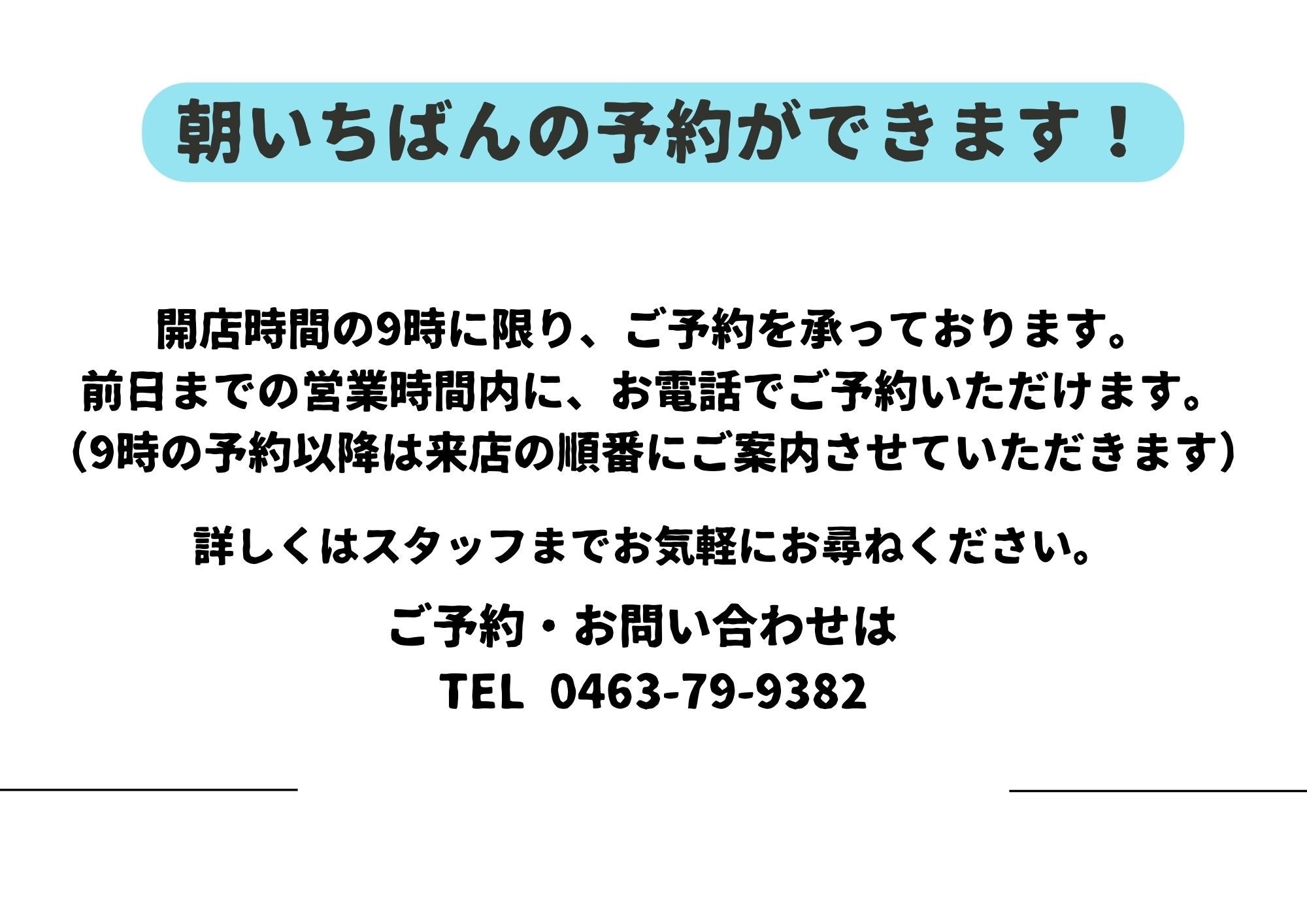 ※朝いちばんの予約については、開店時間の9時のみ予約をお取りすることができます。