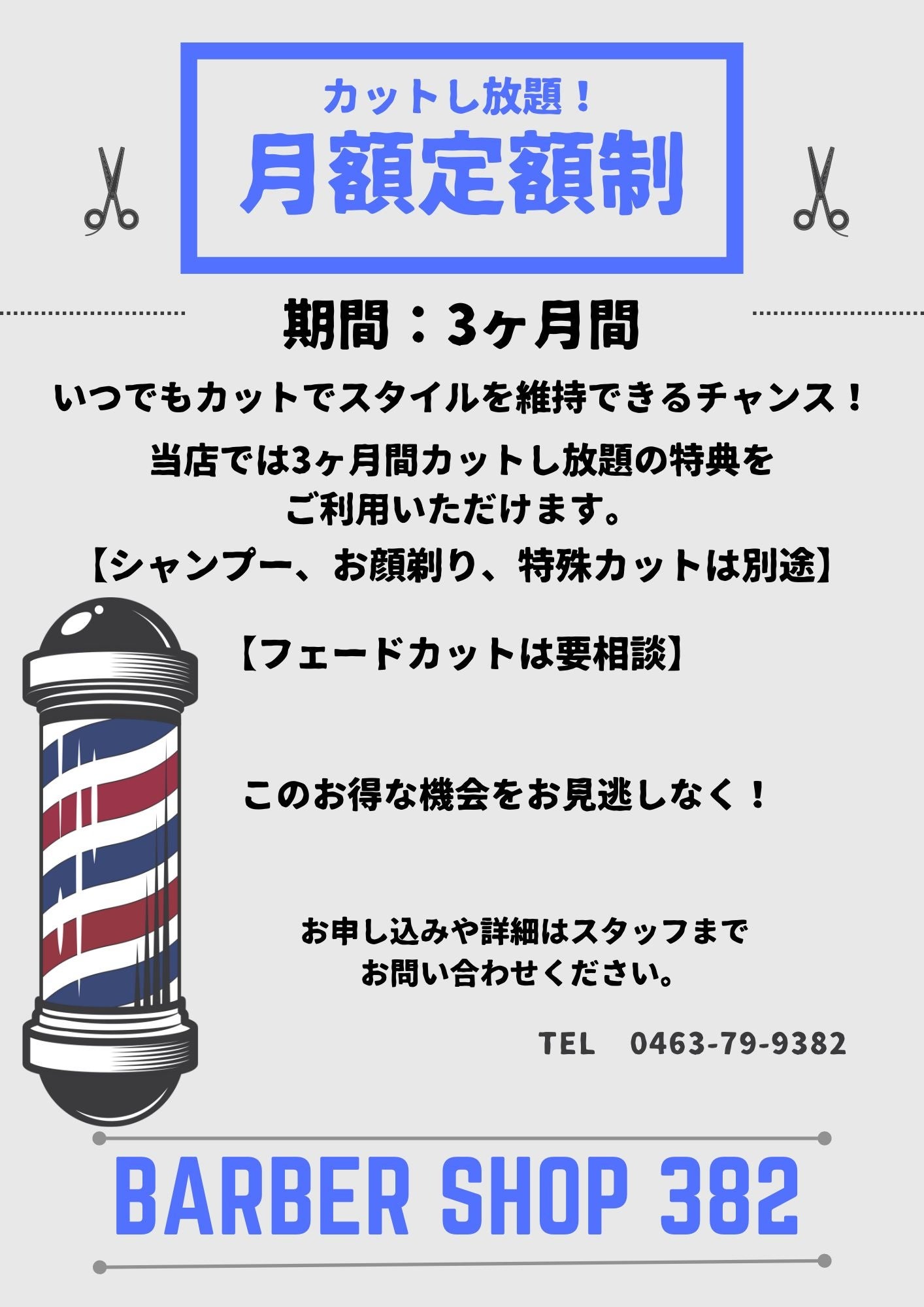 平塚市西真土にあるバーバーショップ✂382は、特別なサービスの月額定額制プランをご用意。