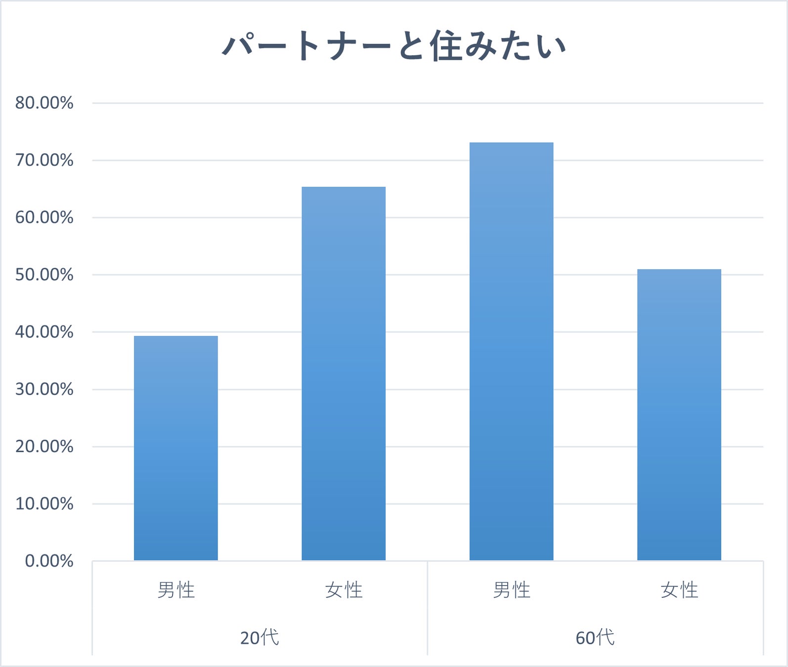 一方、60代では立場が逆転。男性は「孤独を避けたい」という思いから同居を望む割合が高いのに対し、女性は「自立と自由な時間」を楽しむ独立志向が際立っています。老後の住まいにおける価値観の違いが浮き彫りとなりました。