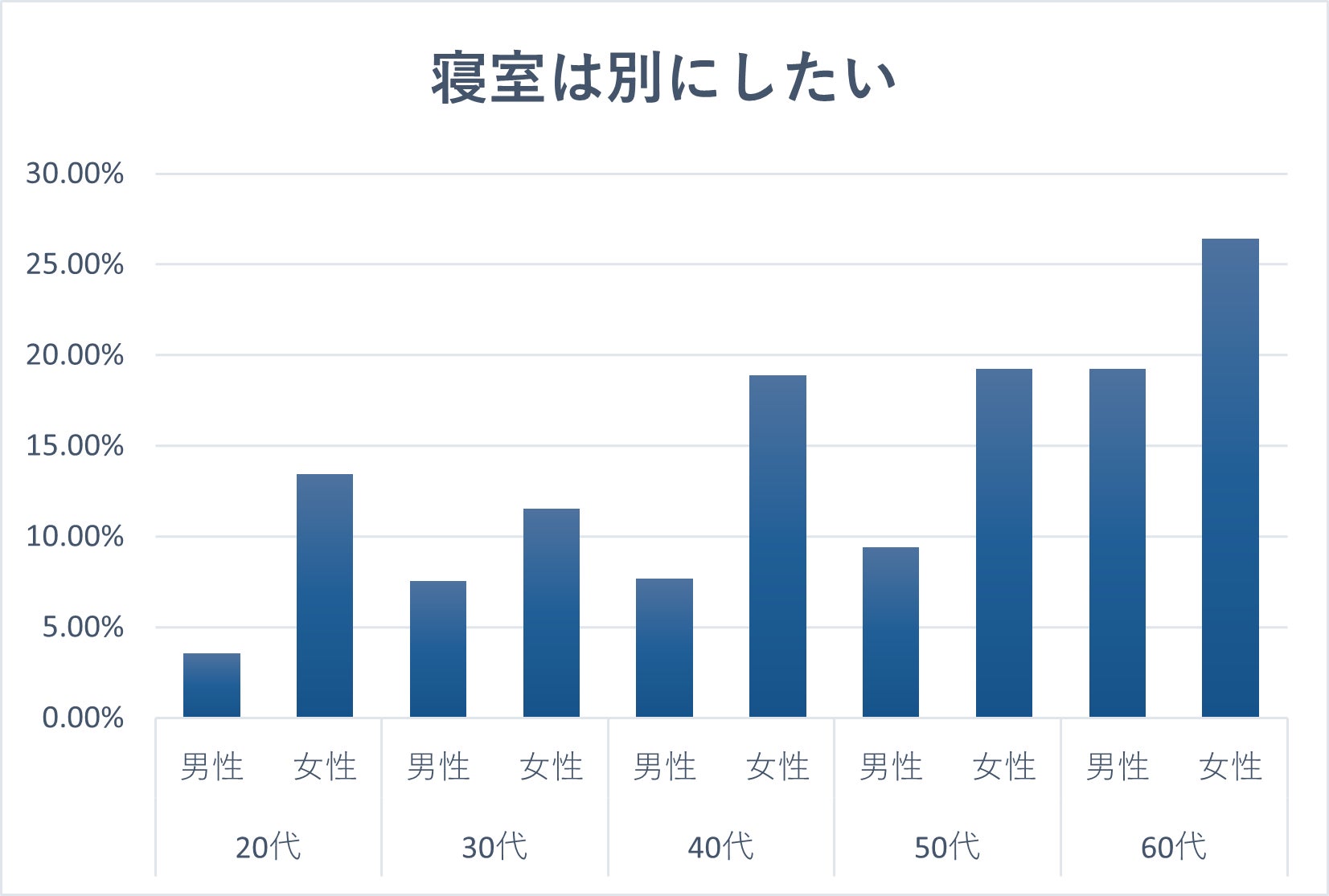 特に60代女性では25%以上が「別寝室」を希望し、その割合は他の年代に比べても突出しています。夫婦関係の中でプライバシーや睡眠の質を重視し、お互いの健康やライフスタイルを尊重する姿勢が背景にあると考えられます。